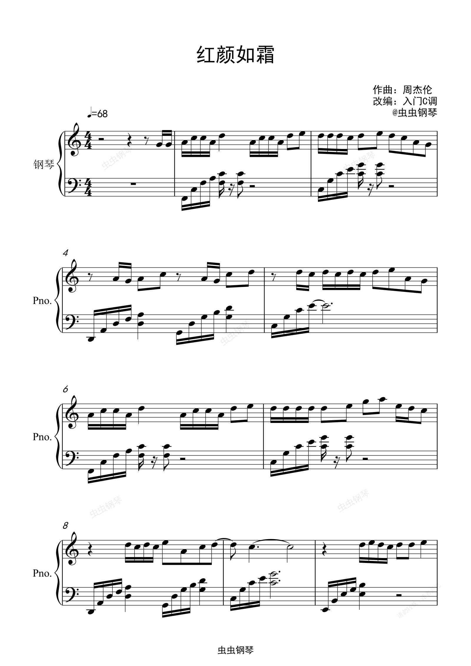 钢琴谱:周杰伦《红颜如霜》入门C调简单版