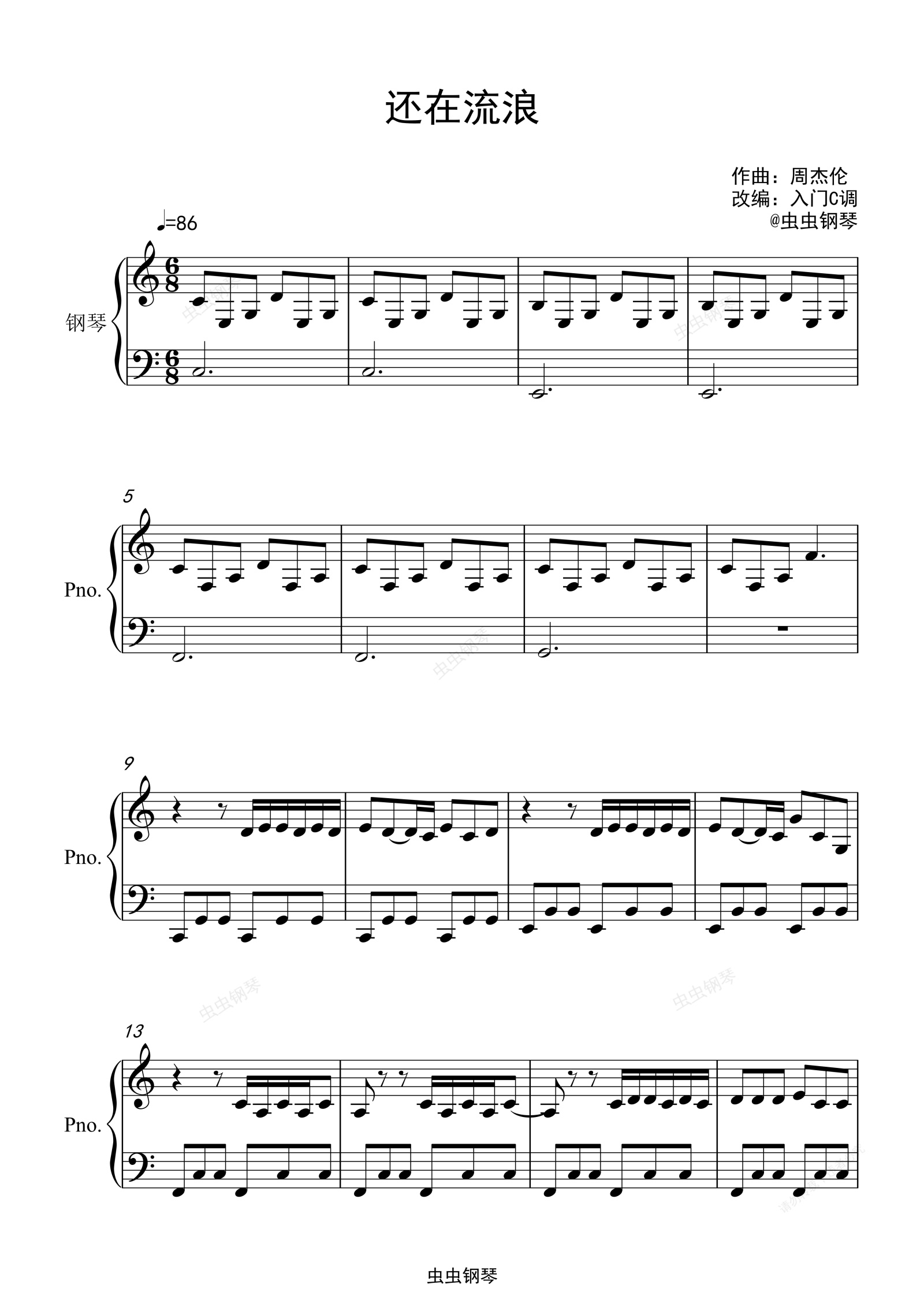 钢琴谱:周杰伦《还在流浪》入门C调简单版