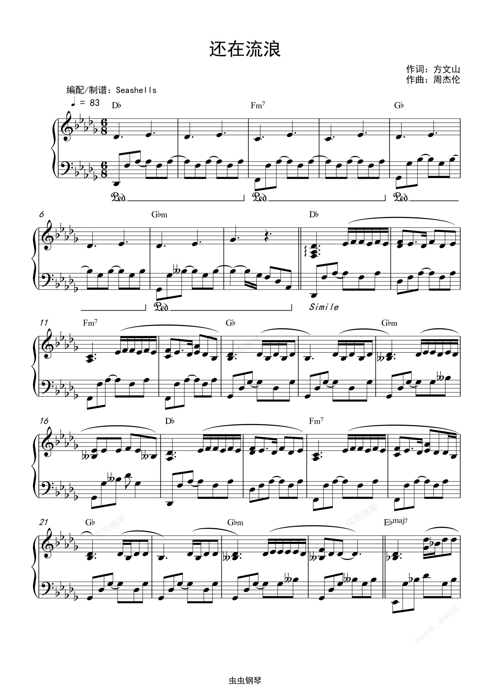 钢琴谱:周杰伦-《还在流浪》精编钢琴独奏 降D调