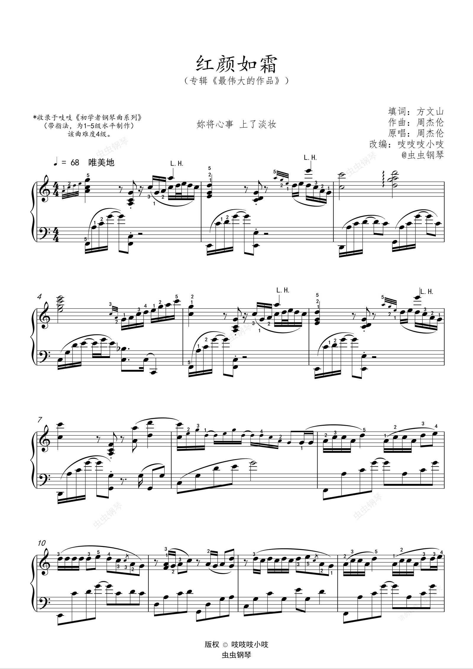 钢琴谱:红颜如霜 C调带指法 《初学者钢琴曲系列》