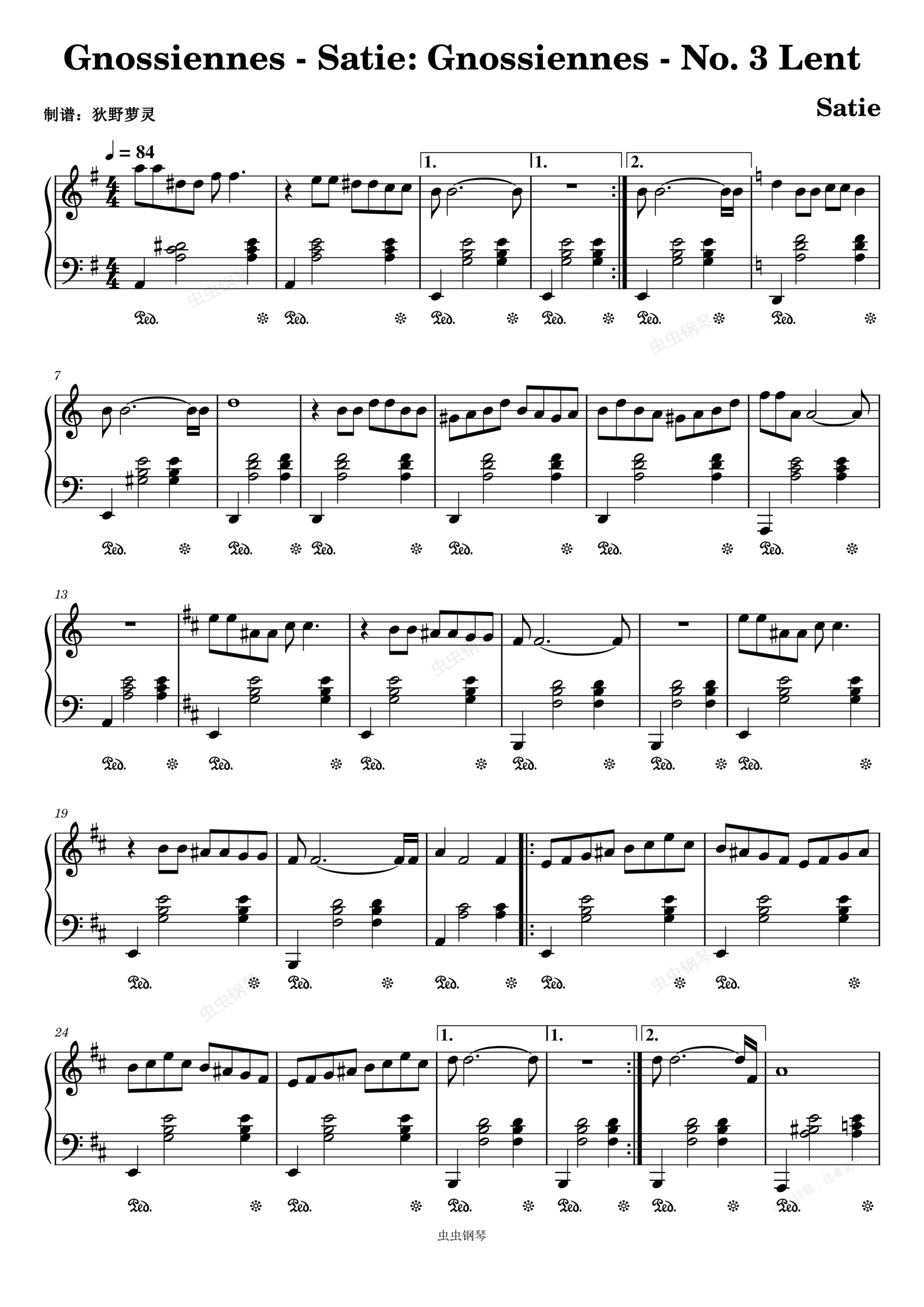 钢琴谱:Gnossiennes - Satie: Gnossiennes - No. 3 Lent