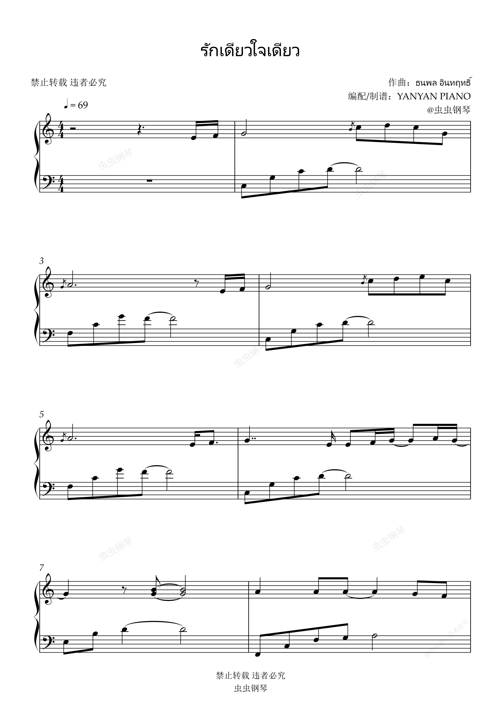 钢琴谱:好听易弹【รักเดียวใจเดียว】เสือ ธนพล