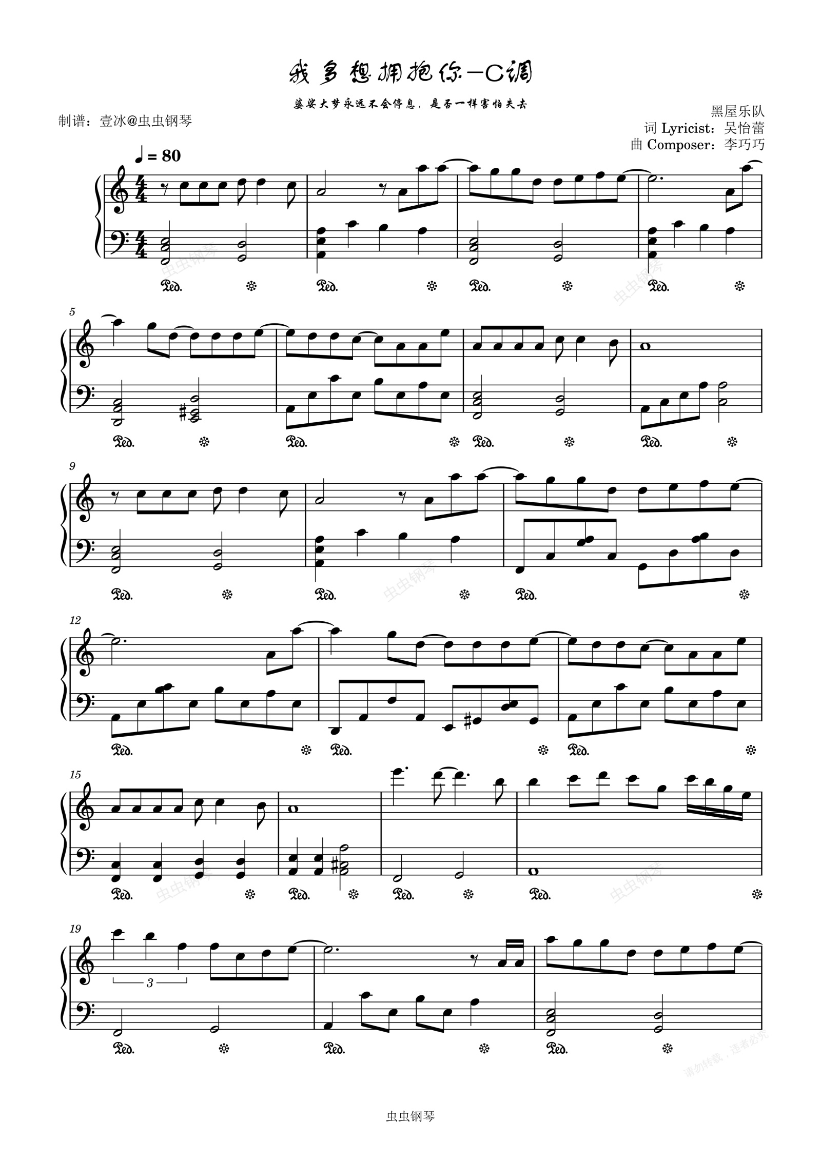 钢琴谱:我多想拥抱你//黑屋乐队-C调版