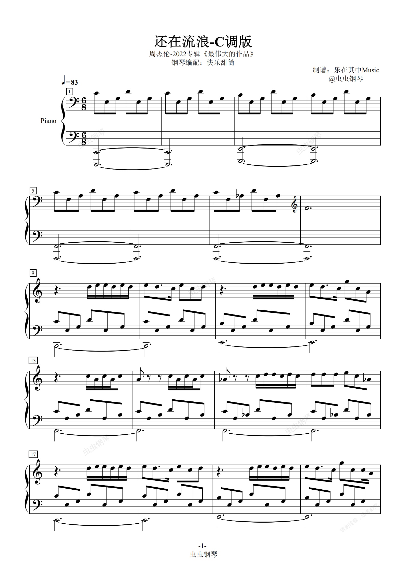 钢琴谱:还在流浪-C调(高还原唯美钢琴独奏)
