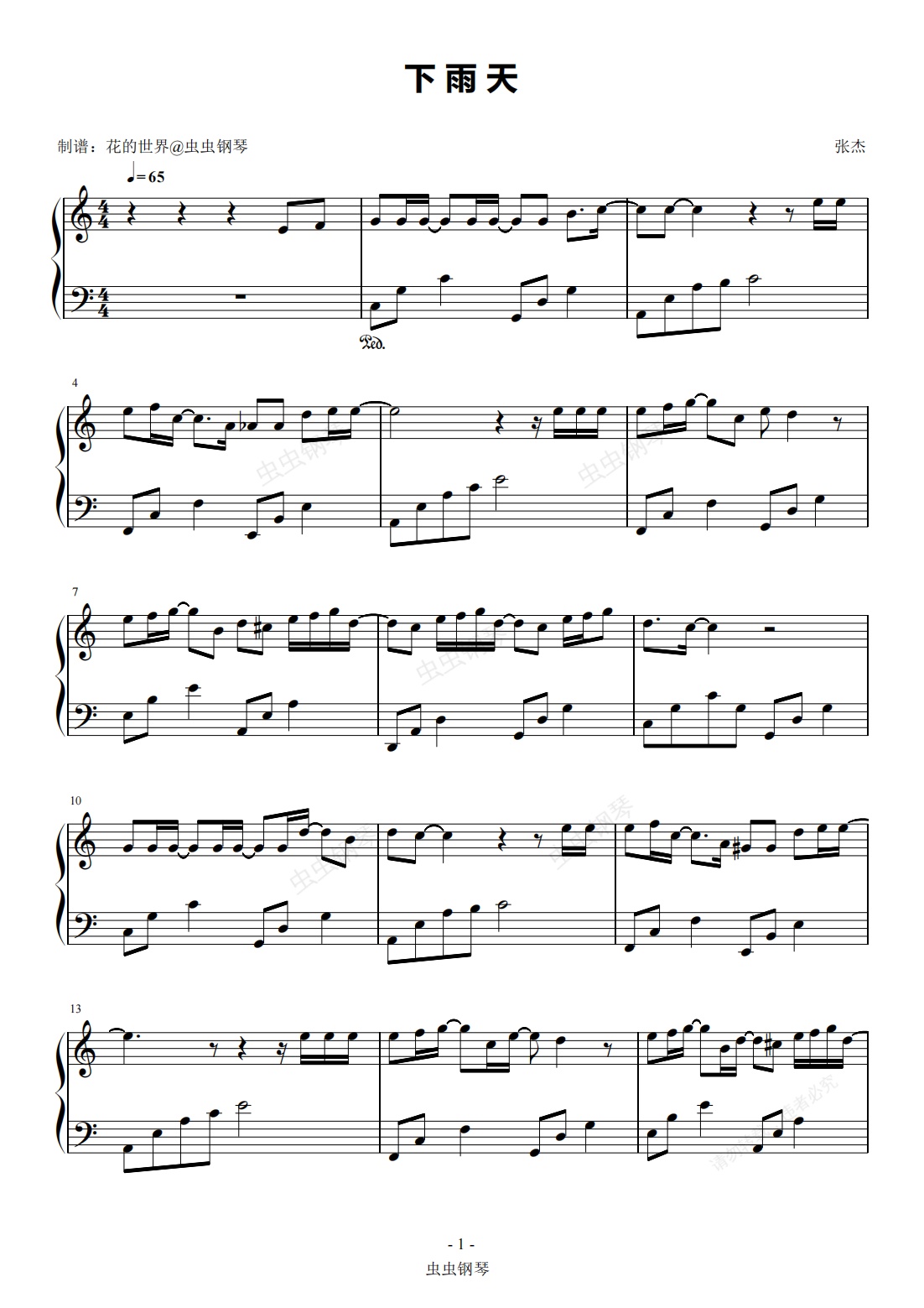 钢琴谱:下雨天 C调简易版 南拳妈妈 梁心颐