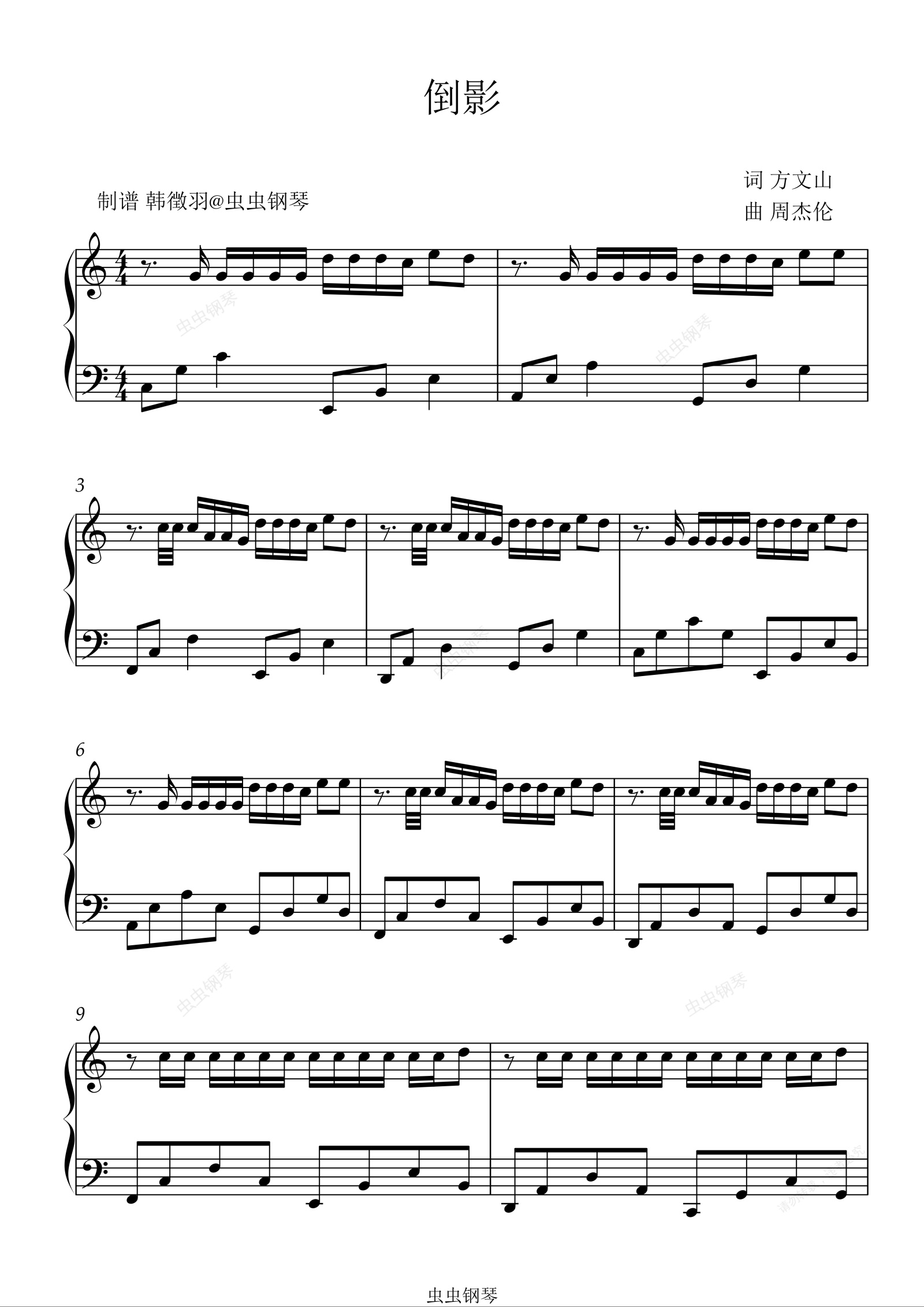 钢琴谱:倒影 周杰伦 C调 适合初学者