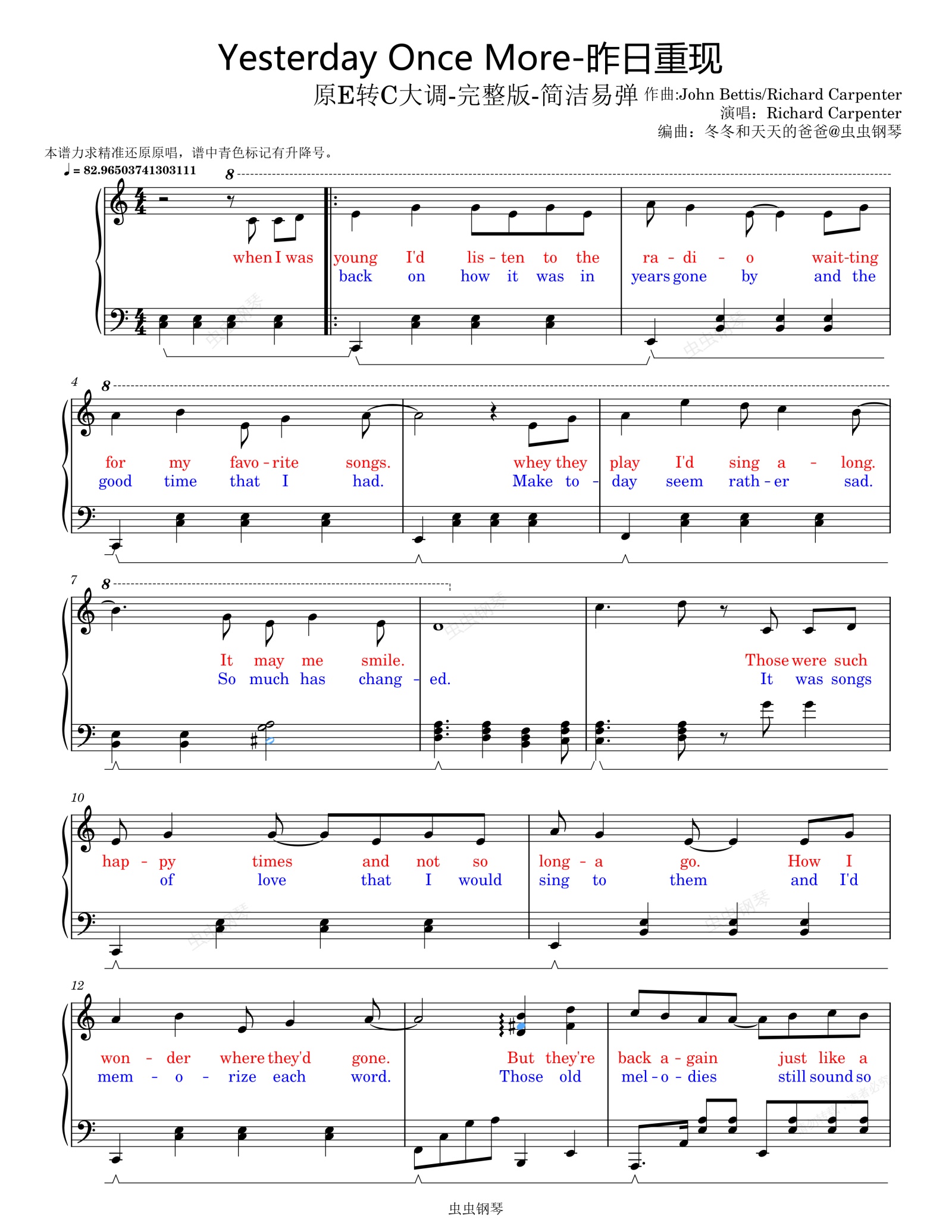 钢琴谱:昨日重现-Yesterday Once More-完整版-简洁易弹-转C大调