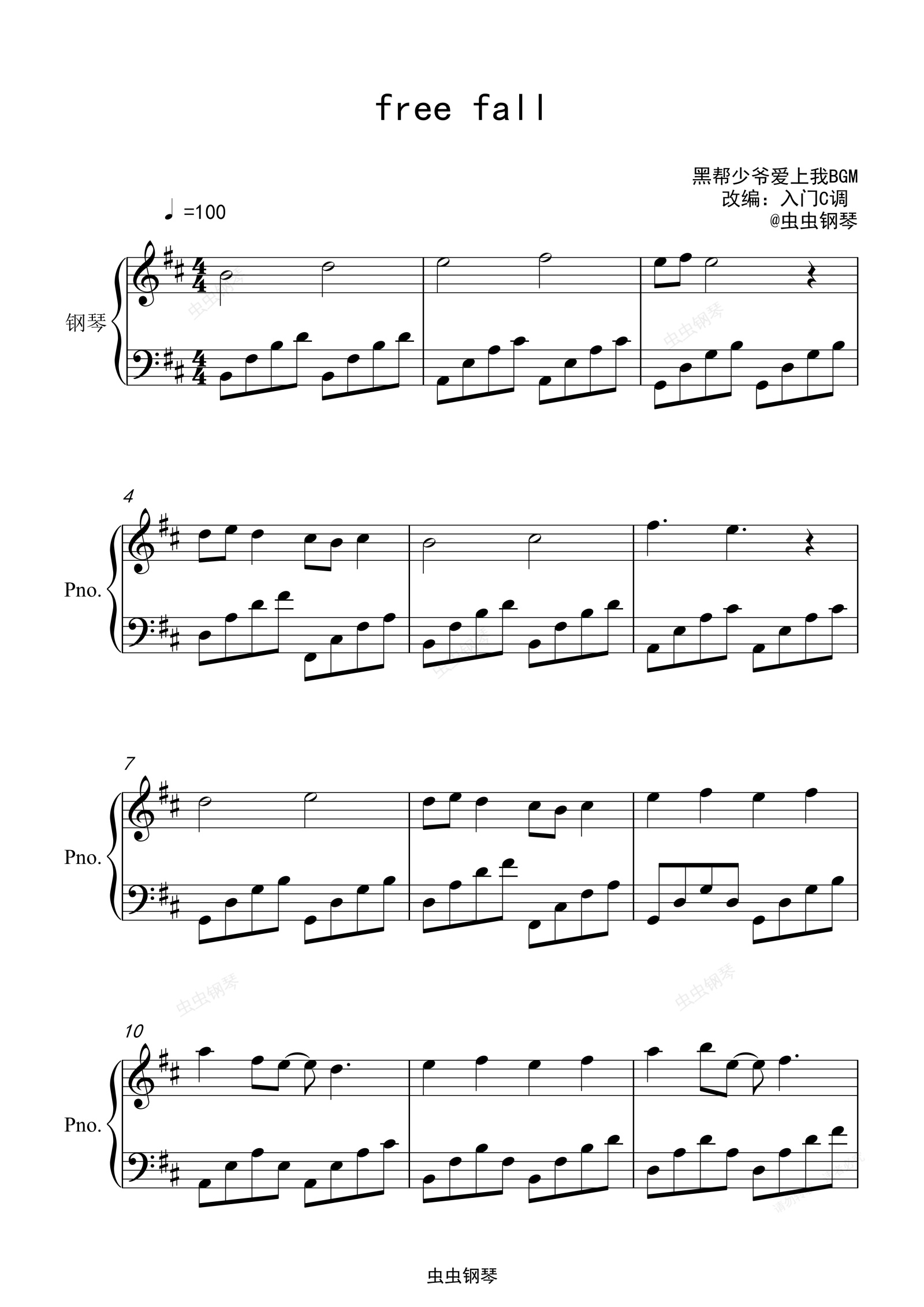 钢琴谱:《黑帮少爷爱上我》BGM《Free Fall》D调简单抒情版