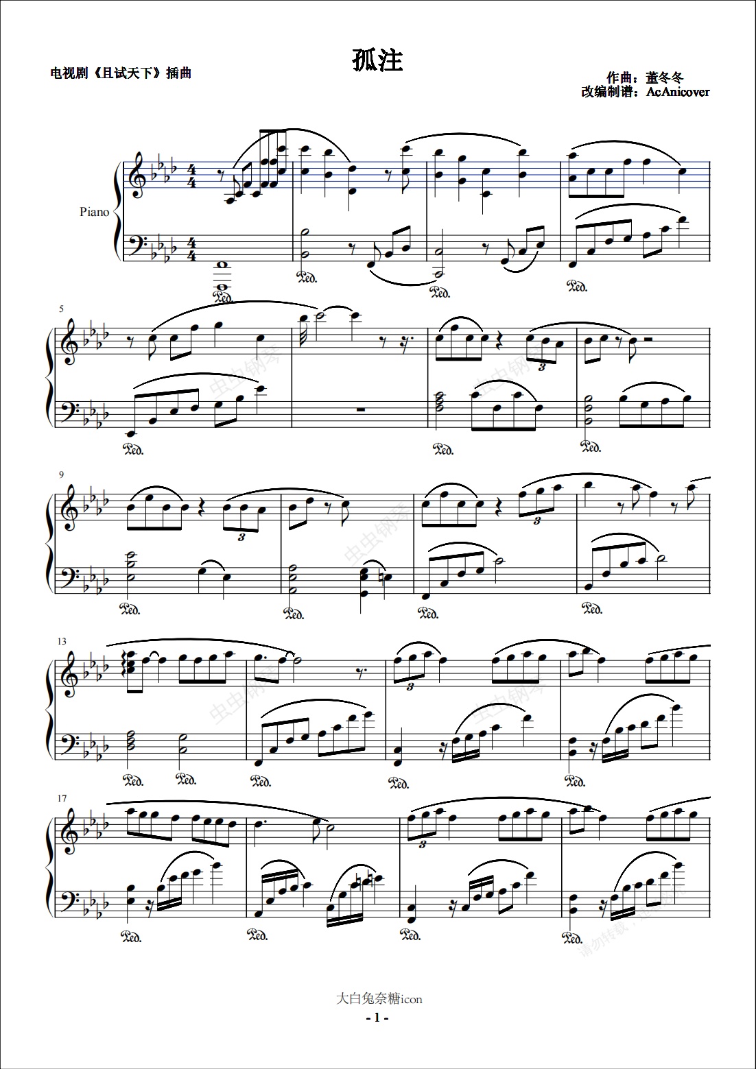 钢琴谱:孤注-且试天下-插曲-谭维维-降A大调