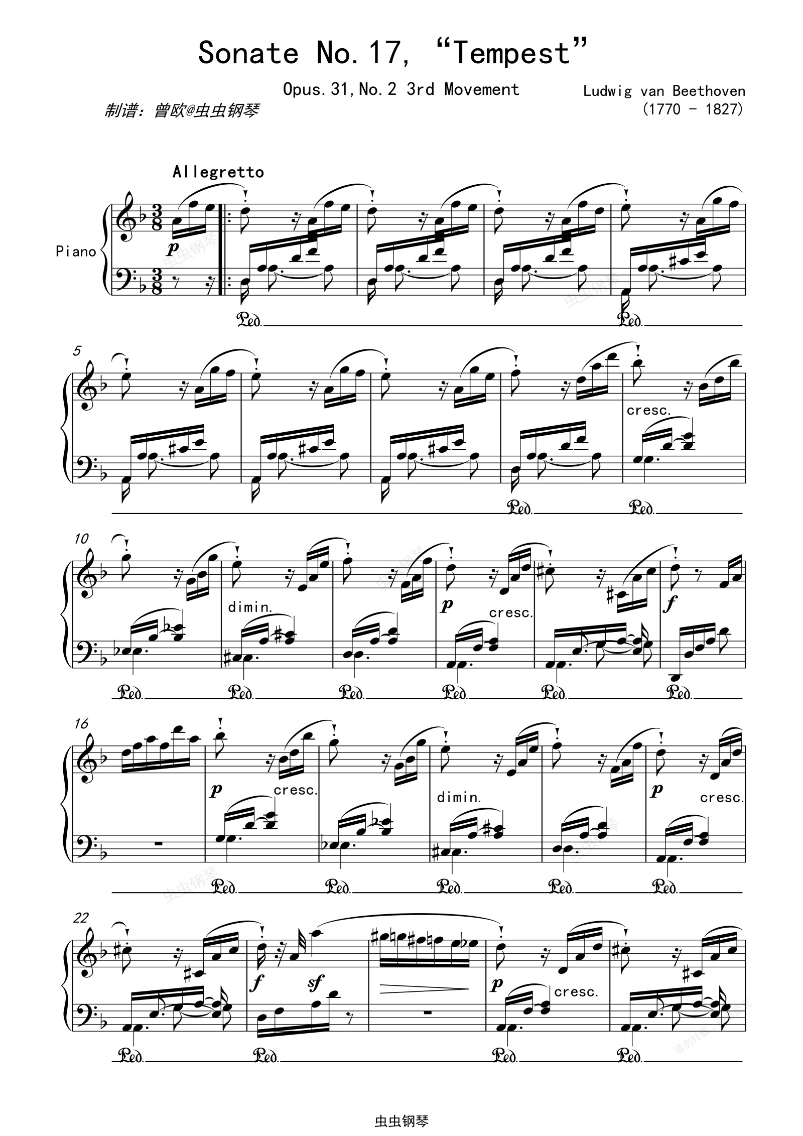 贝多芬在创作《暴风雨奏鸣曲》时,正是他听觉衰退、精神危机的时刻,他在几个月后写的“海里根士脱遗嘱”中说自己“六年以来我的身体何等恶劣……可是我不能对人说:‘大声些,我是聋子’……这感官在我是应该特别比别人优越……我不致自杀是因为艺术留住了我。在我尚未把我感到的使命全部完成之前,我觉得不能离开这个世界。