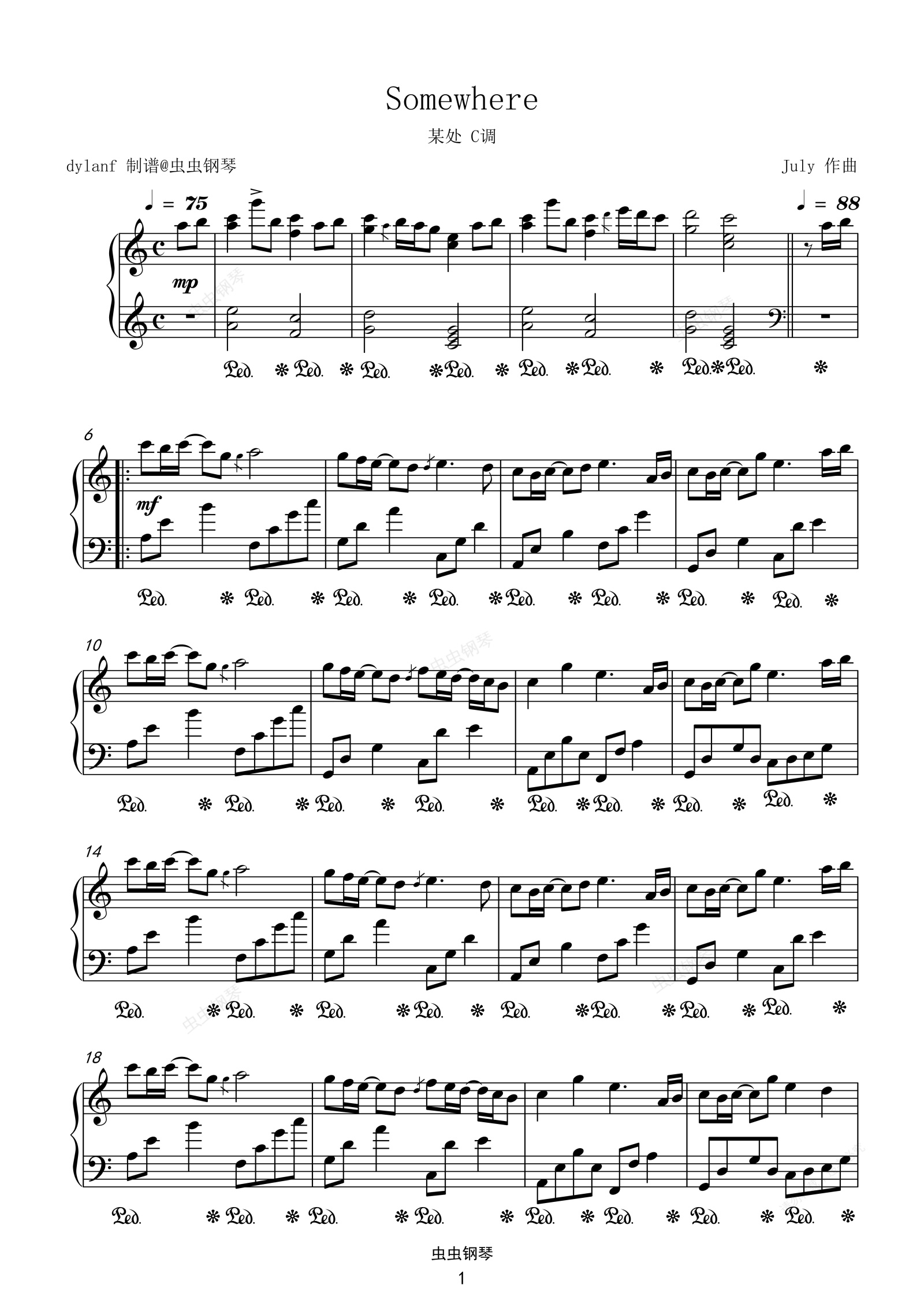 钢琴谱:C调 Somewhere 好听治愈 某处 July