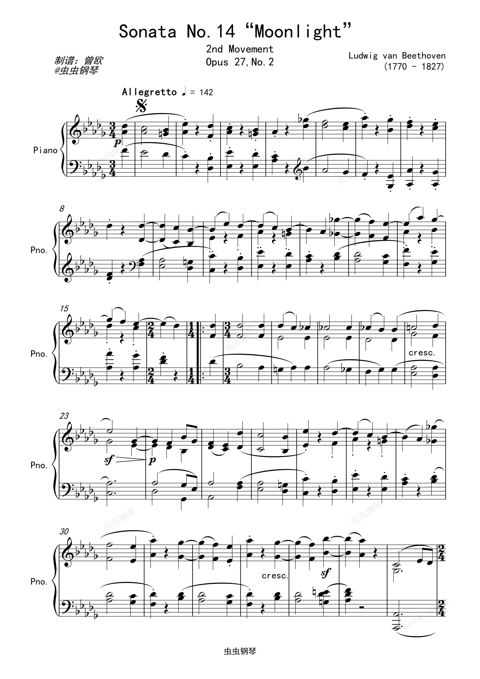 第二章以轻快的节奏中止了第一章的沉思冥想,又引来了第三章的紧张痛苦,李斯特称它是「两个深渊中的一朵小花」。在这一章里贝多芬似乎又短暂地陷入了浪漫回忆,篇章短小又愉快轻盈。