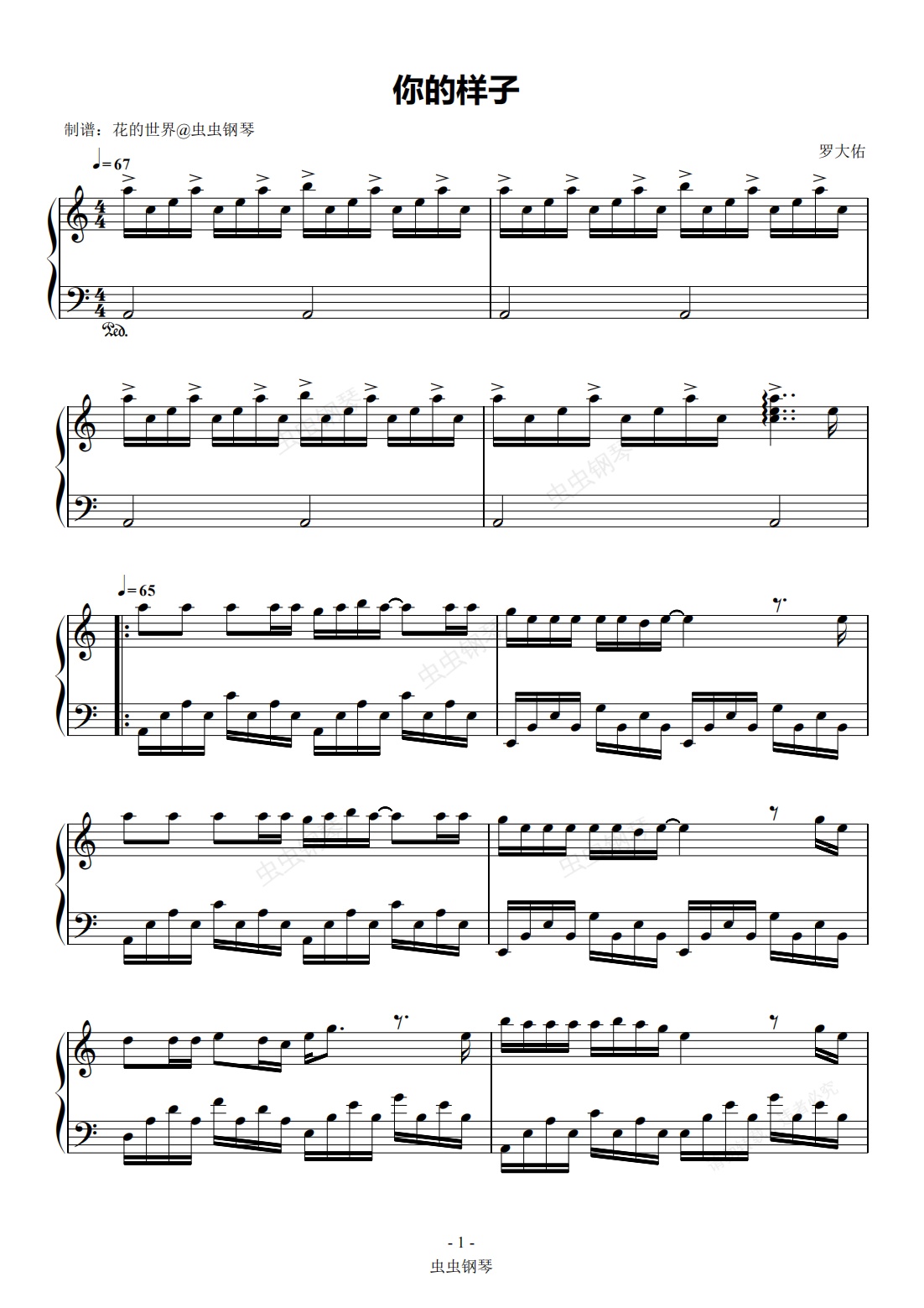 钢琴谱:你的样子 C调简易版 罗大佑 流行经典