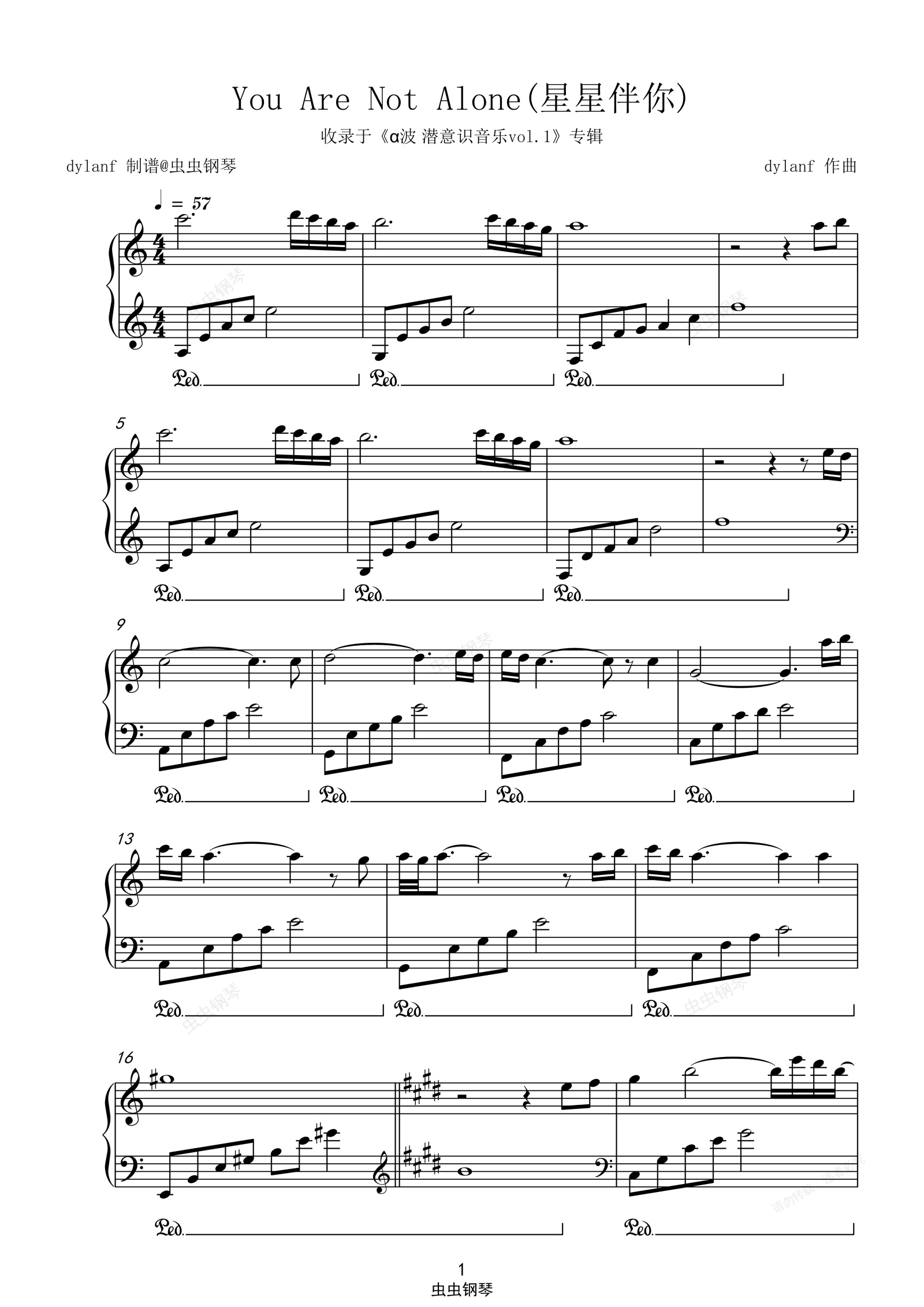 钢琴谱:You are not alone(星星伴你)α波 潜意识音乐 dylanf 星光钢琴曲