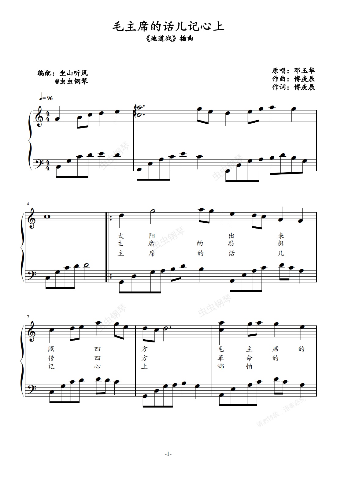 钢琴谱:毛主席的话儿记心上——唯美入门版(大音符)