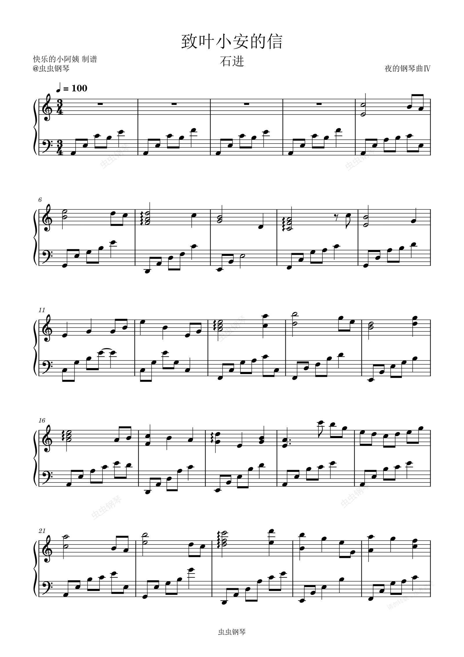 钢琴谱:致叶小安的信-夜的钢琴曲ⅣC调