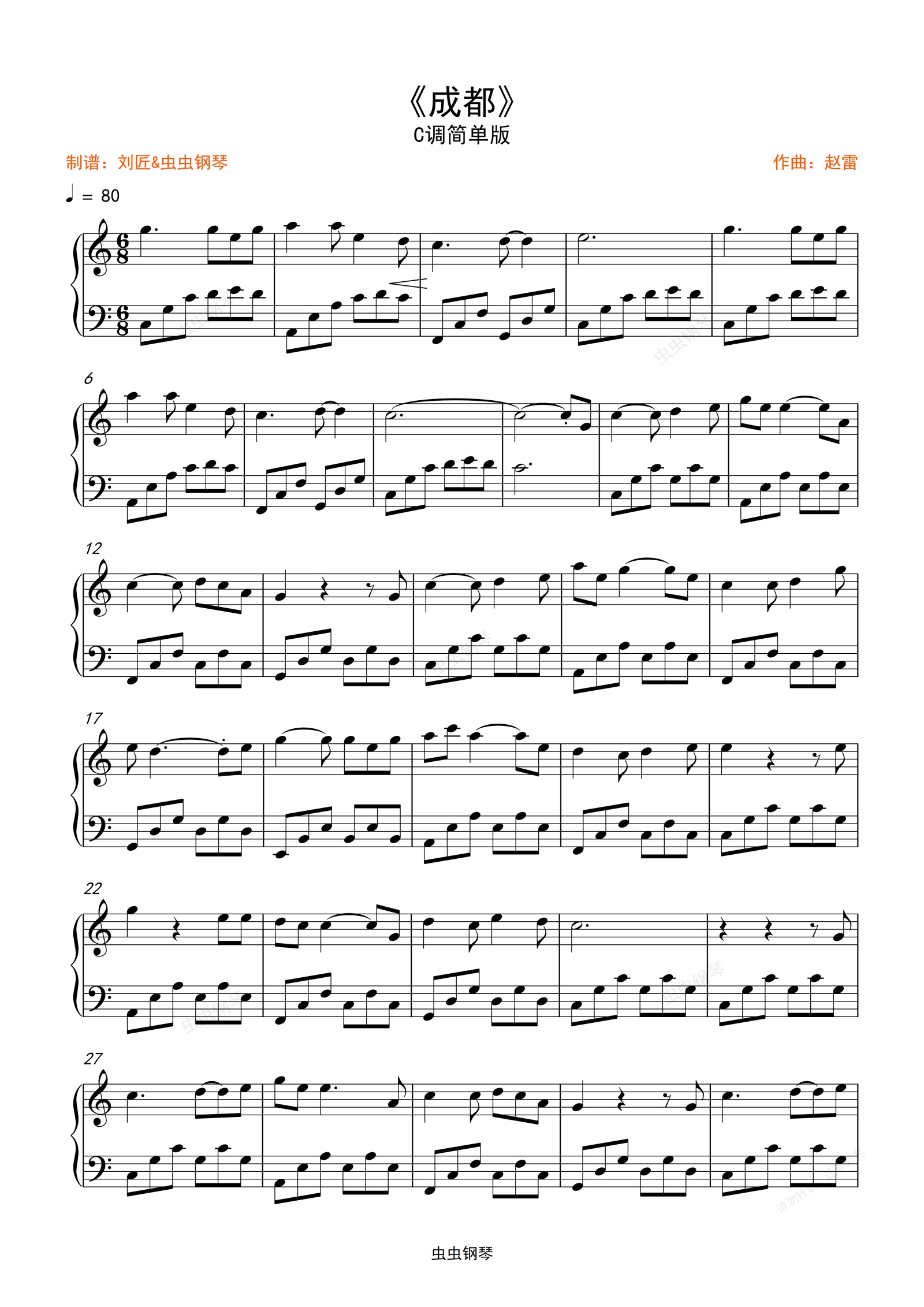 钢琴谱:成都-赵雷-刘匠编制-C调简单版