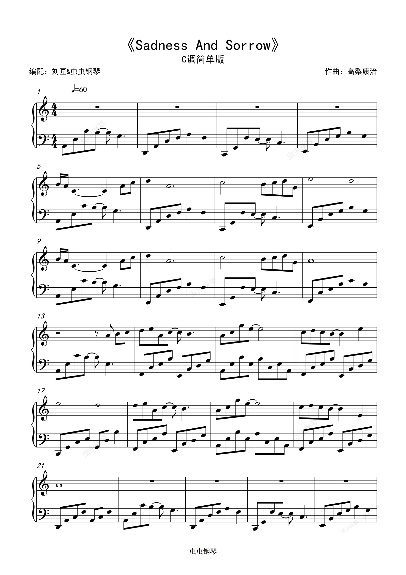 钢琴谱:哀伤-sadness and sorrow-刘匠编配-C调简易版