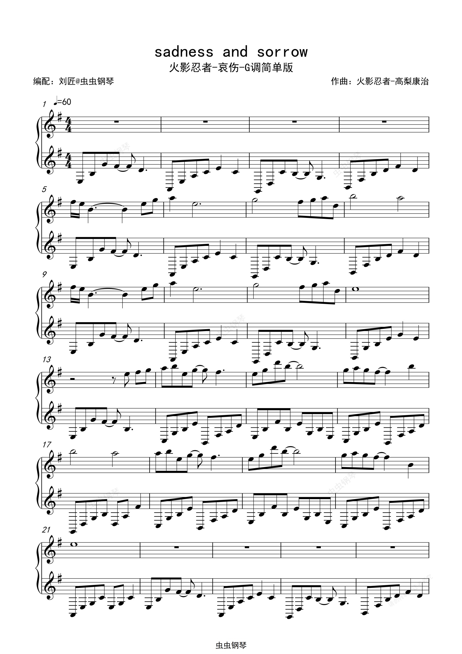 钢琴谱:哀伤-sadness and sorrow-刘匠编配-G调简易版