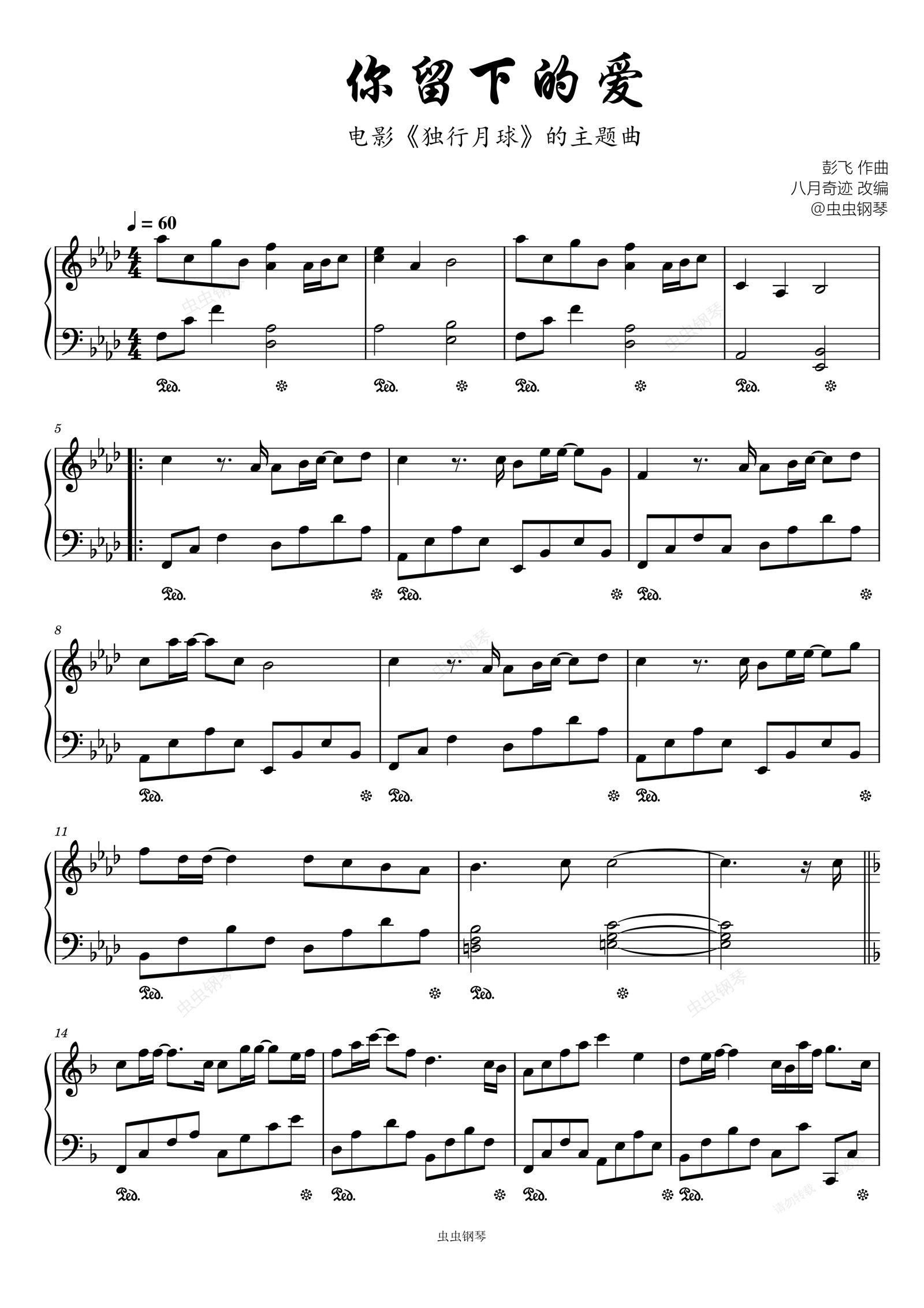 钢琴谱:《你留下的爱》电影《独行月球》的主题曲