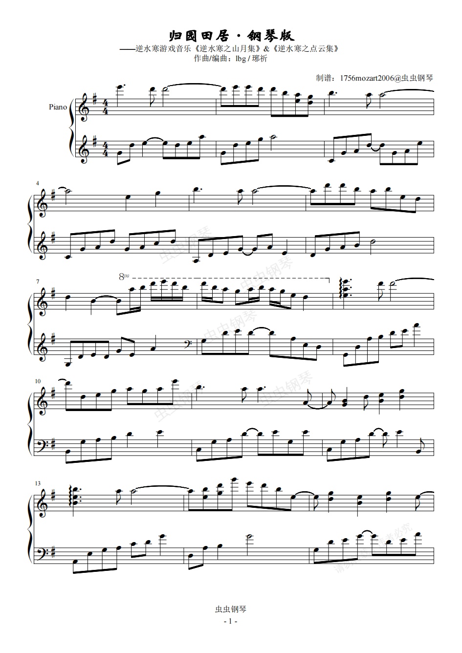钢琴谱:归园田居 · 钢琴版