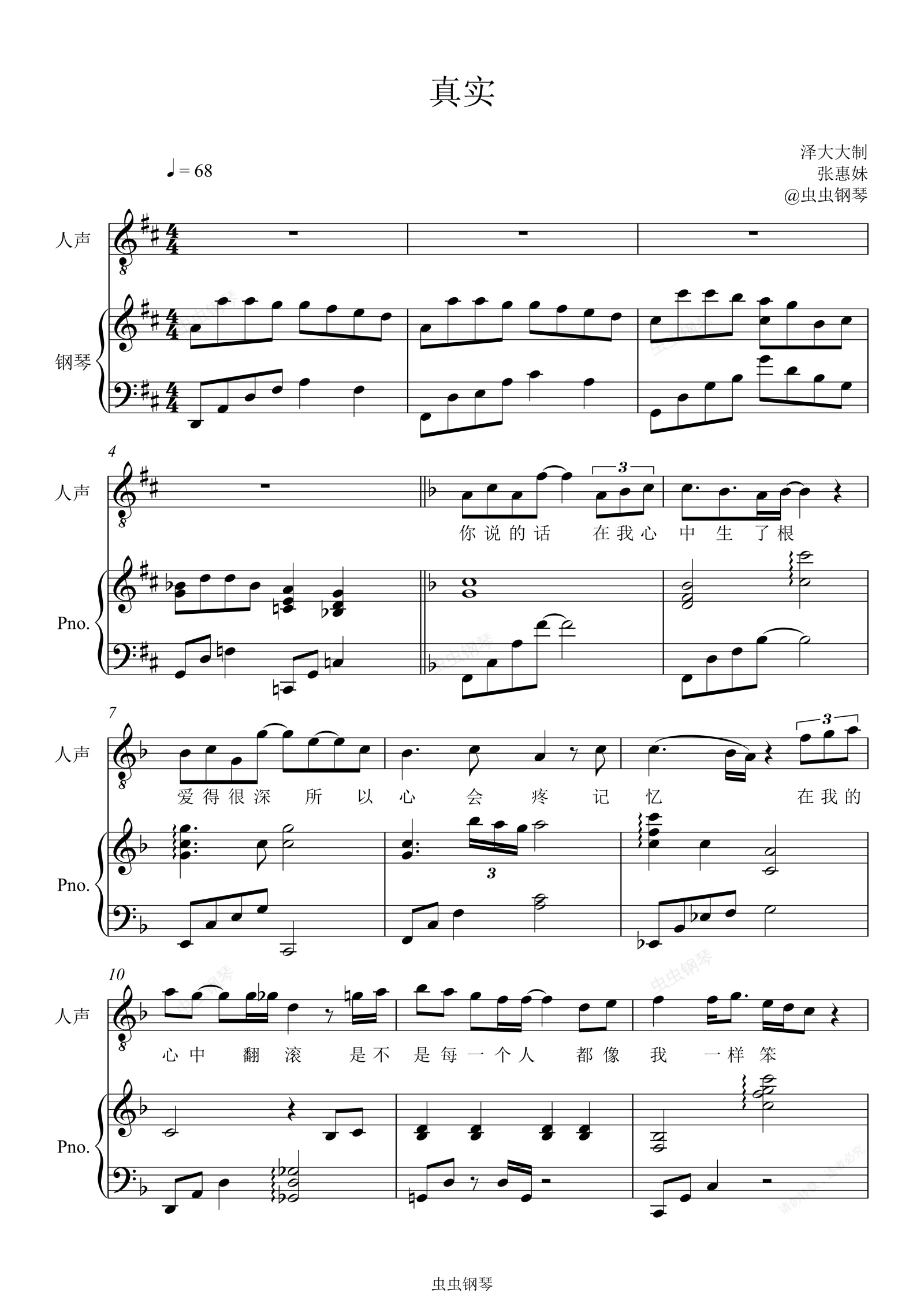 钢琴谱:真实【F调弹唱附词】泽大大 张惠妹