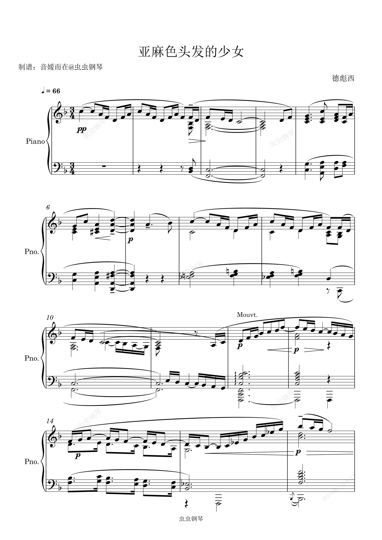 钢琴谱:德彪西 - 亚麻色头发的少女 F调【德彪西最有名名曲之一】