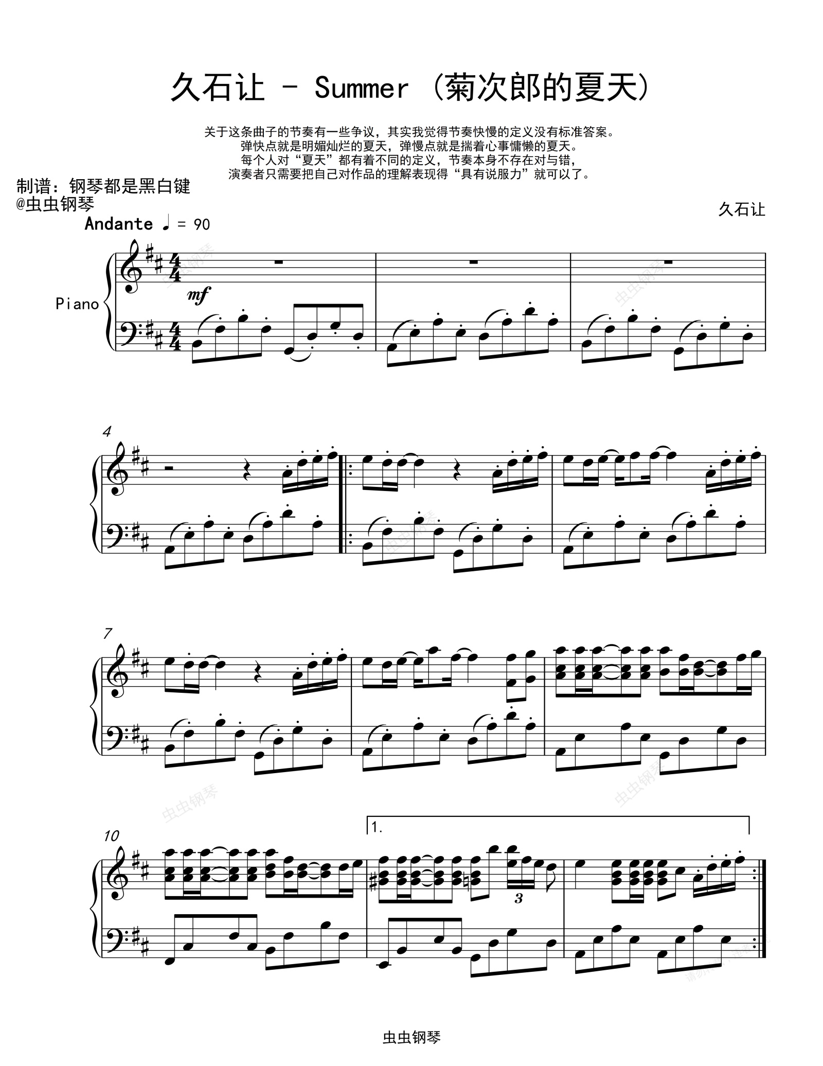 钢琴谱:久石让 - Summer (菊次郎的夏天) 【注弹奏技巧与建议】