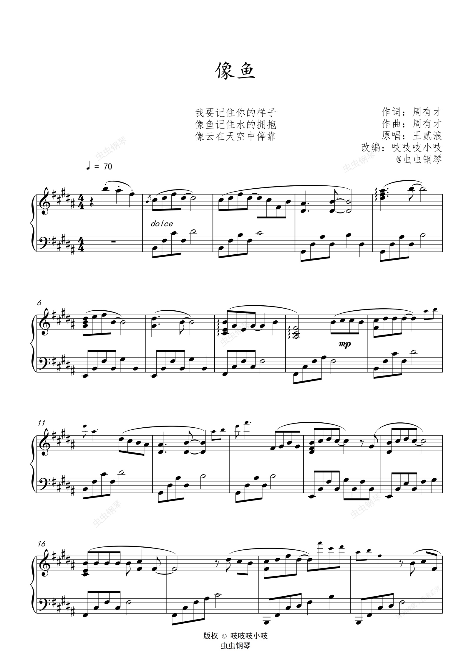 钢琴谱:像鱼 B 王贰浪 【初级难度】 吱吱编配