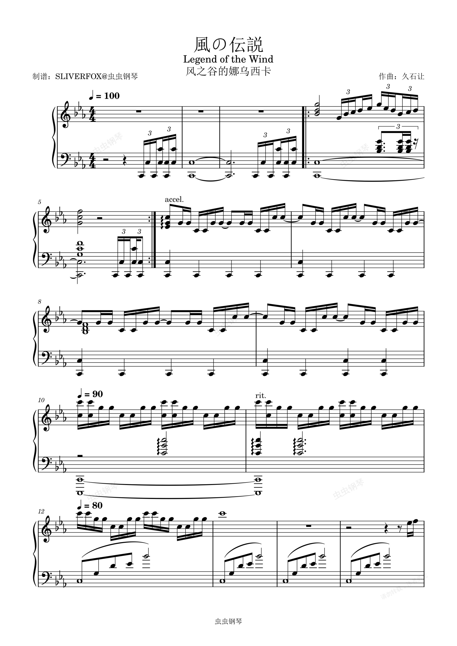 钢琴谱:《風の伝説》久石让 风之谷的娜乌西卡主题曲独奏版