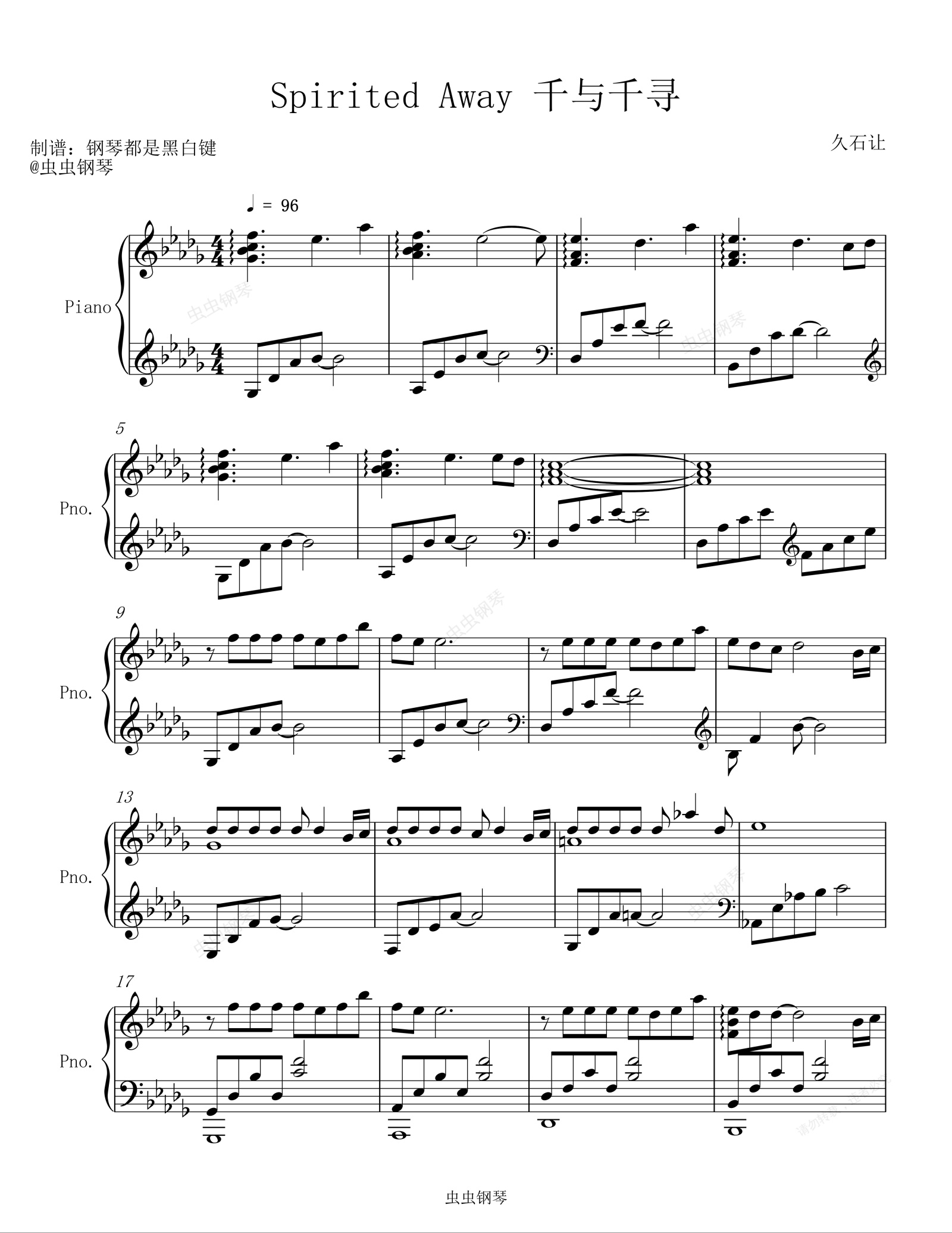 钢琴谱:Spirited Away/あの夏へ 千与千寻 【好听易弹钢琴】