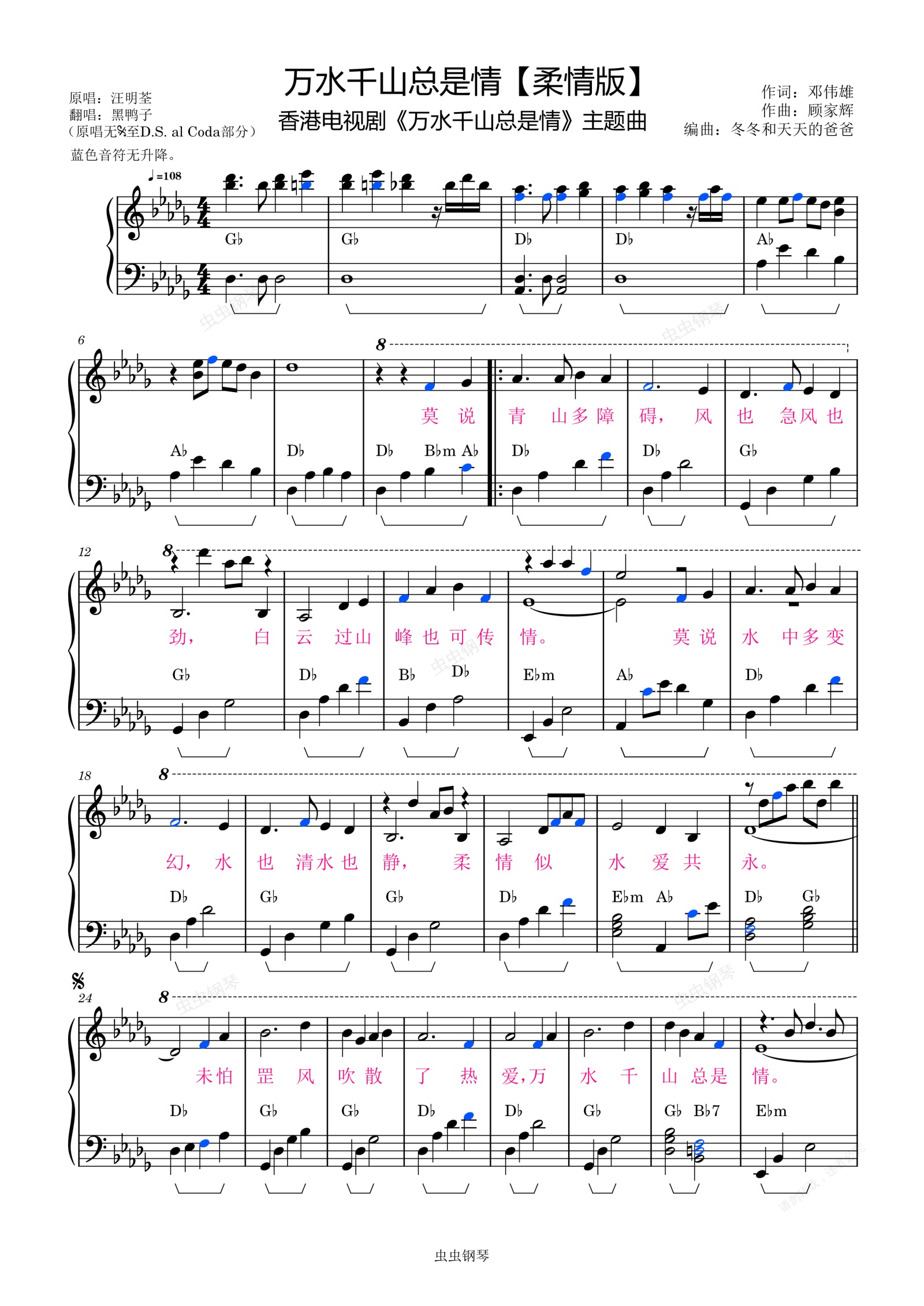 钢琴谱:万水千山总是情-Db大调【柔情版】简洁易弹