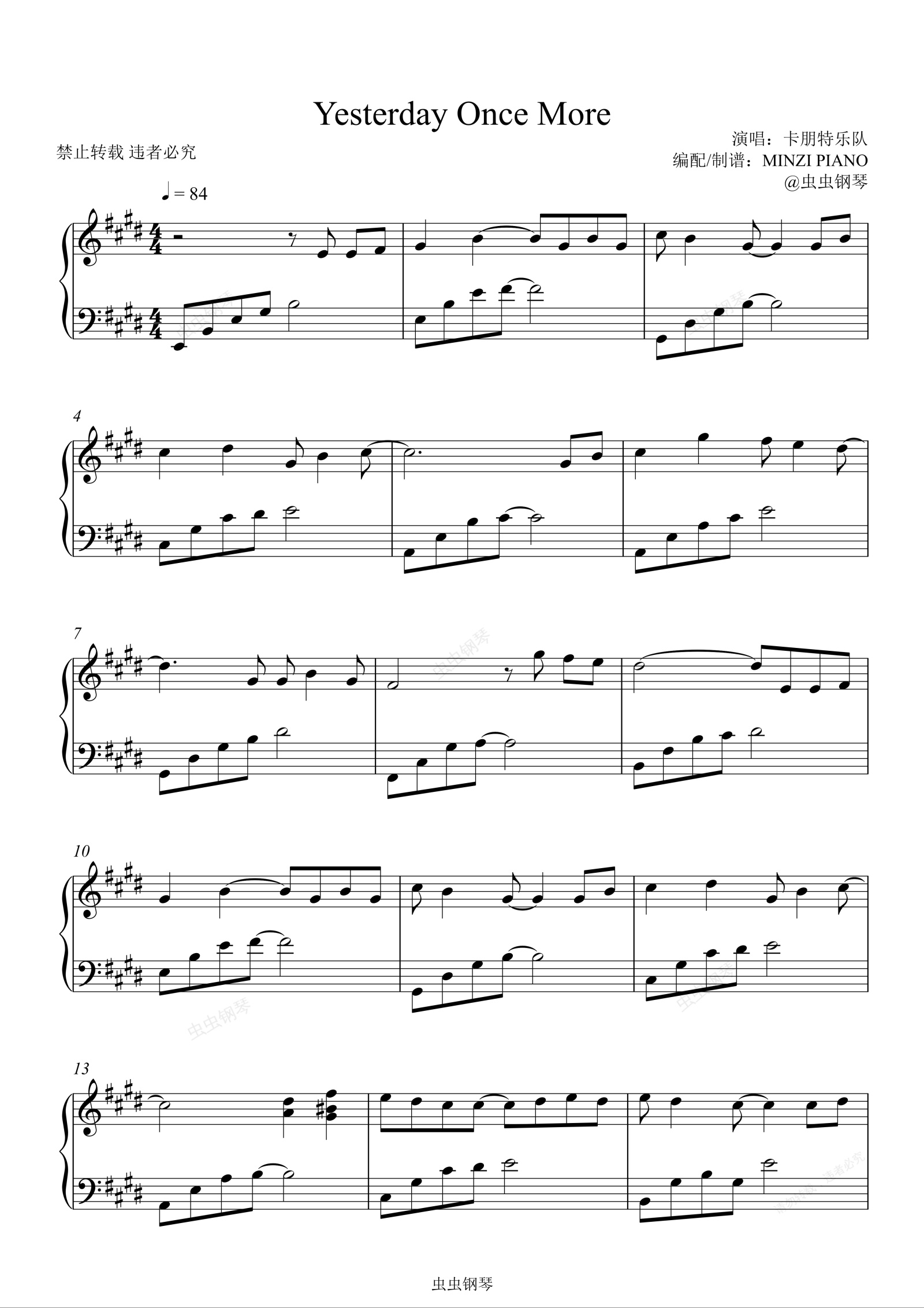 钢琴谱:原调 昨日重现《Yesterday Once More》Carpenters
