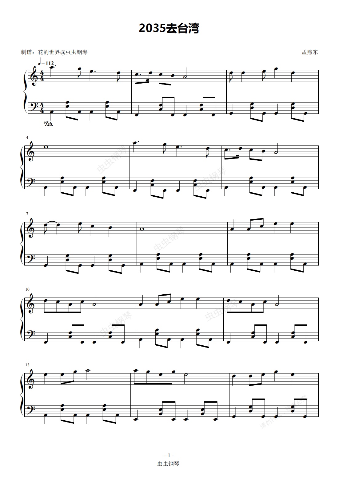 钢琴谱:2035去台湾 C调简易版 孟煦东、庞惠晨