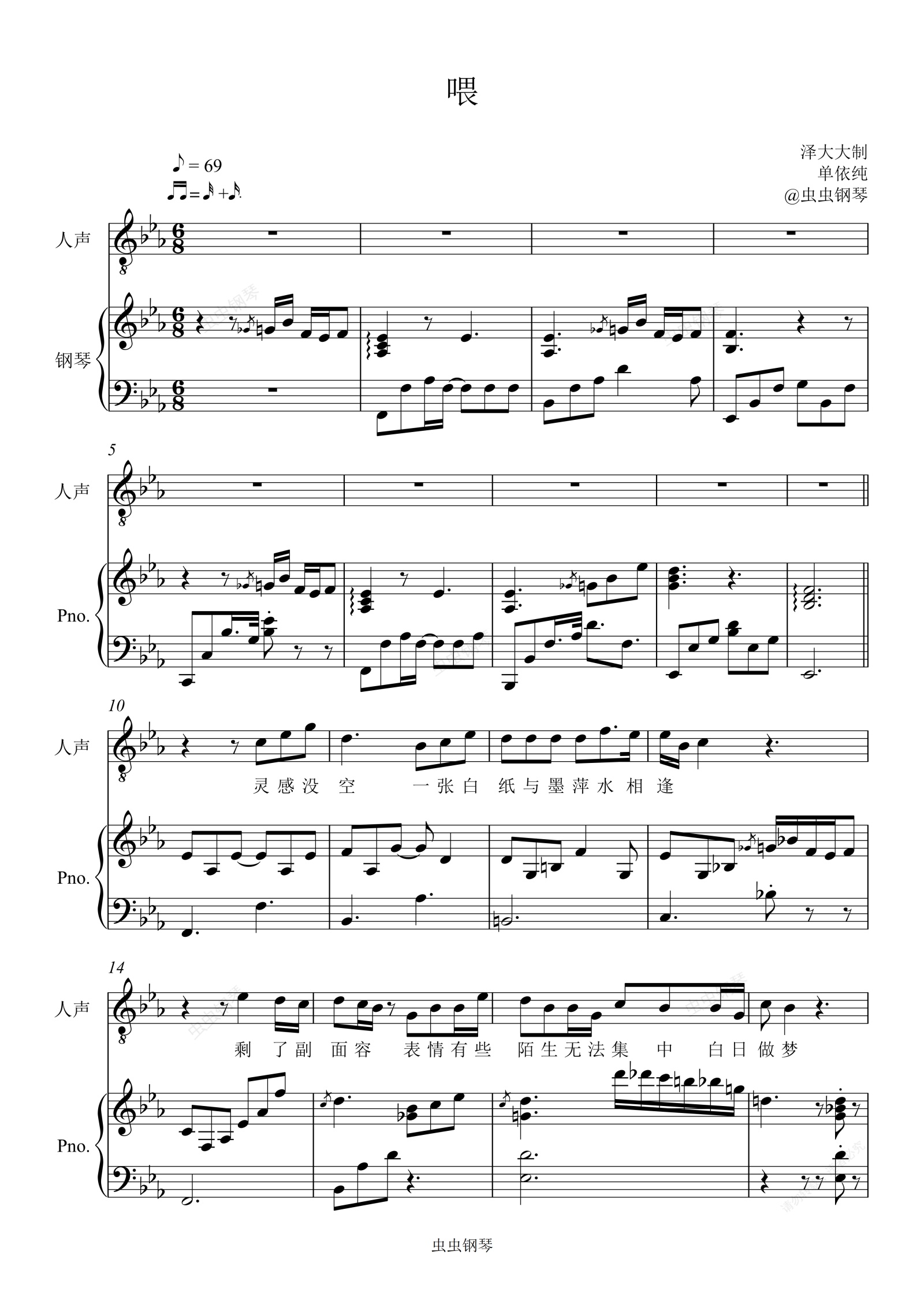 钢琴谱:喂【原版精编弹唱附词】泽大大 单依纯