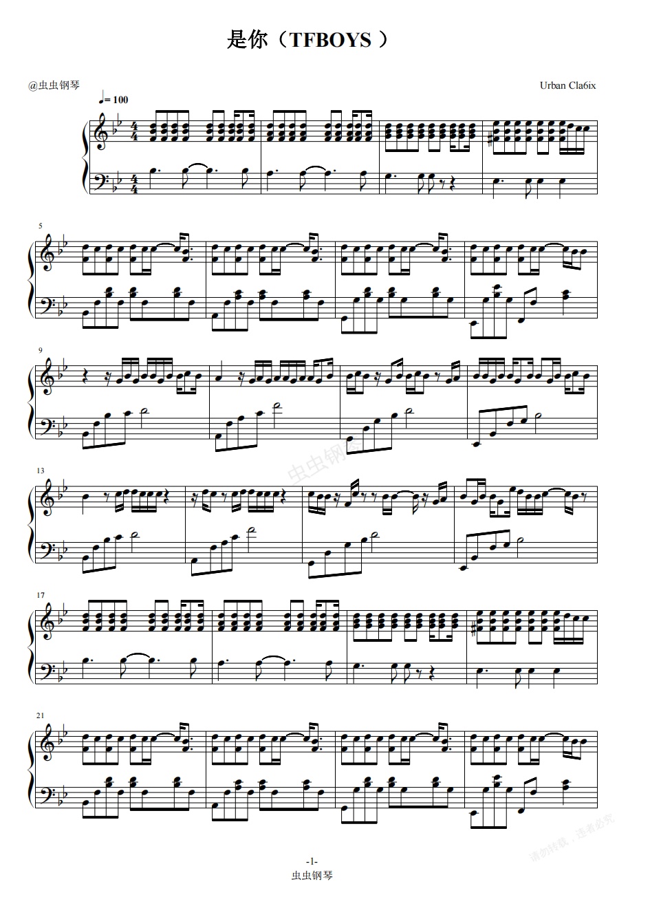 钢琴谱:是你(TFBOYS )降B大调 钢琴独奏谱