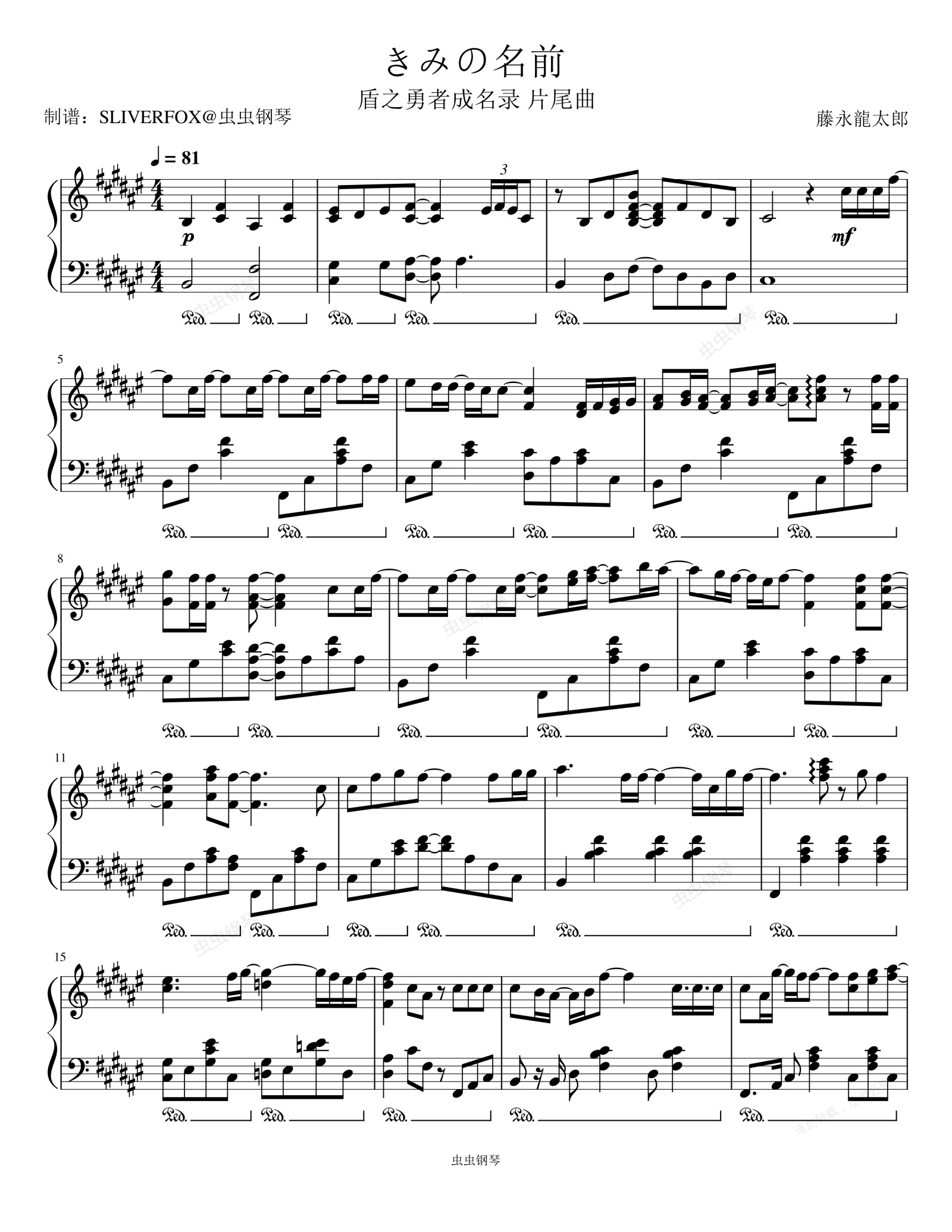 钢琴谱:《きみの名前》盾之勇者成名录片尾曲(你的名字)独奏