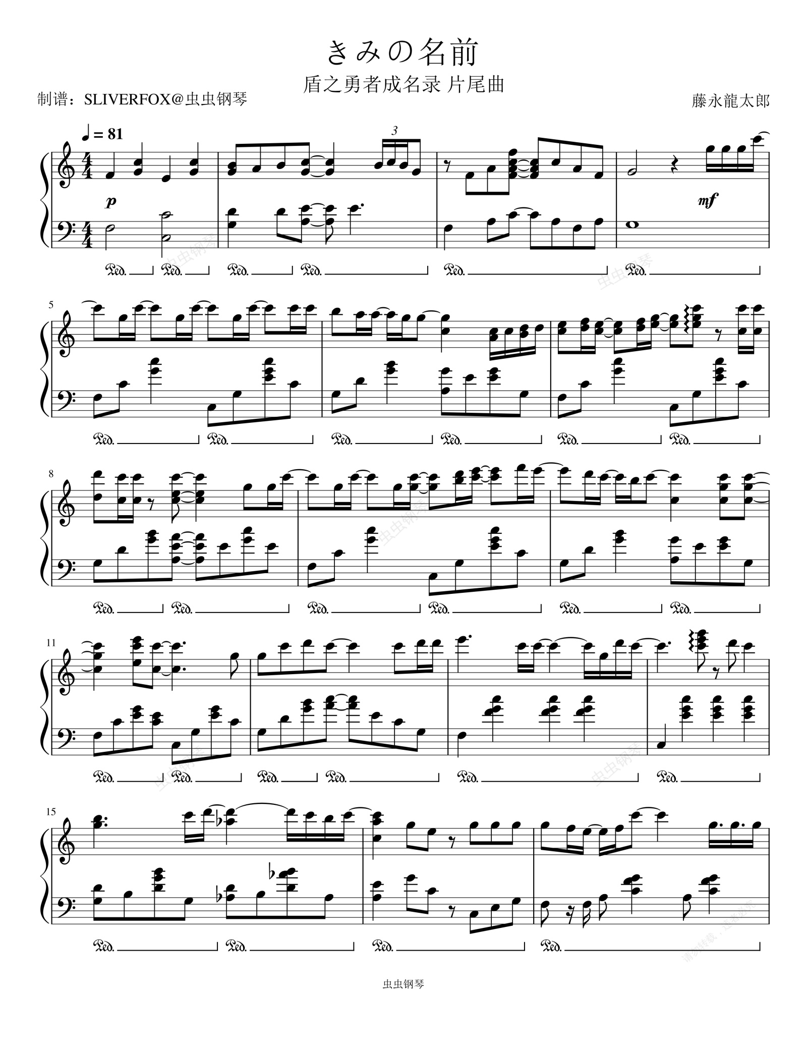 钢琴谱:《きみの名前》盾之勇者成名录片尾曲(你的名字)C调独奏