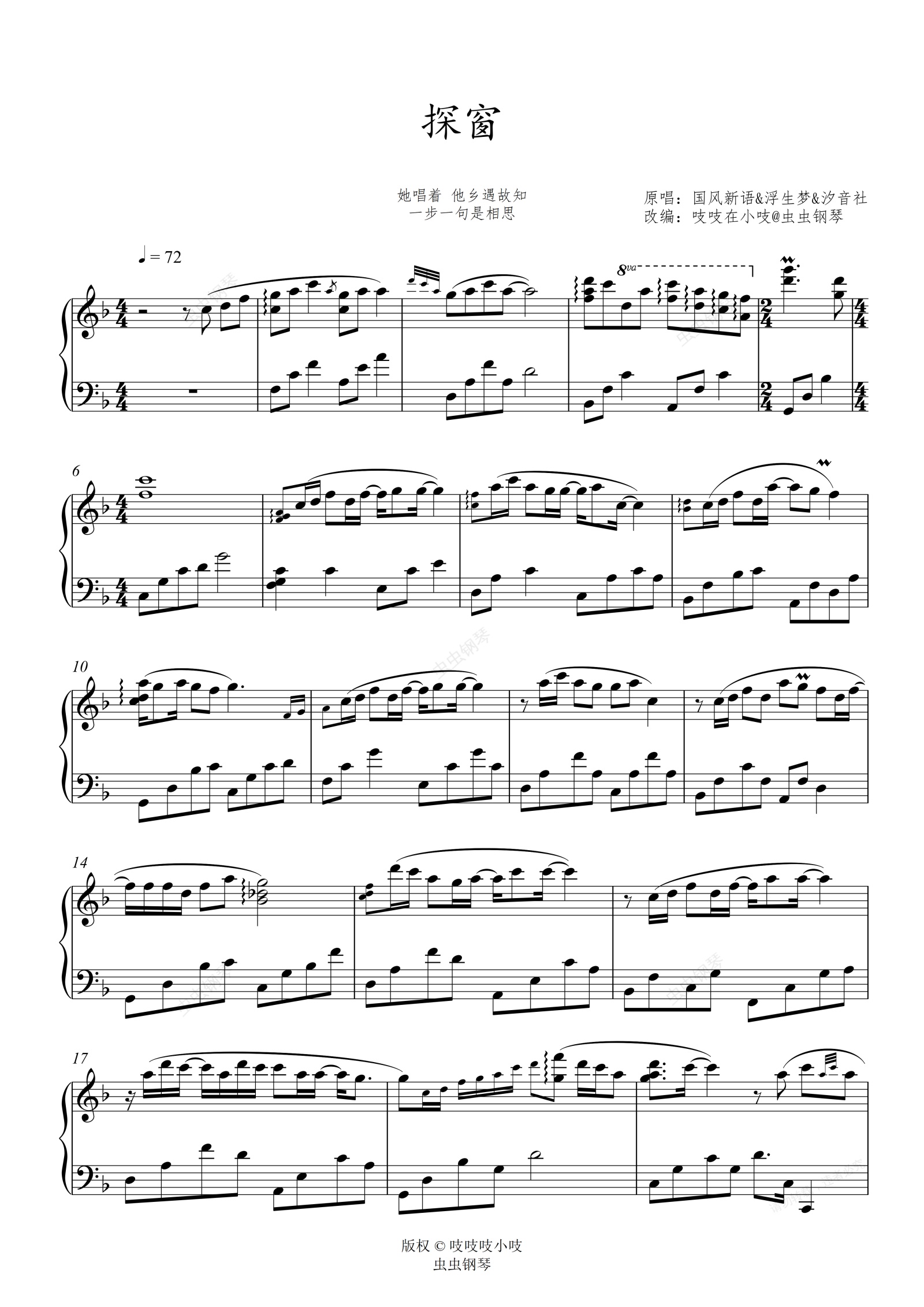 钢琴谱:探窗 F 国风 【初级难度】 吱吱编配