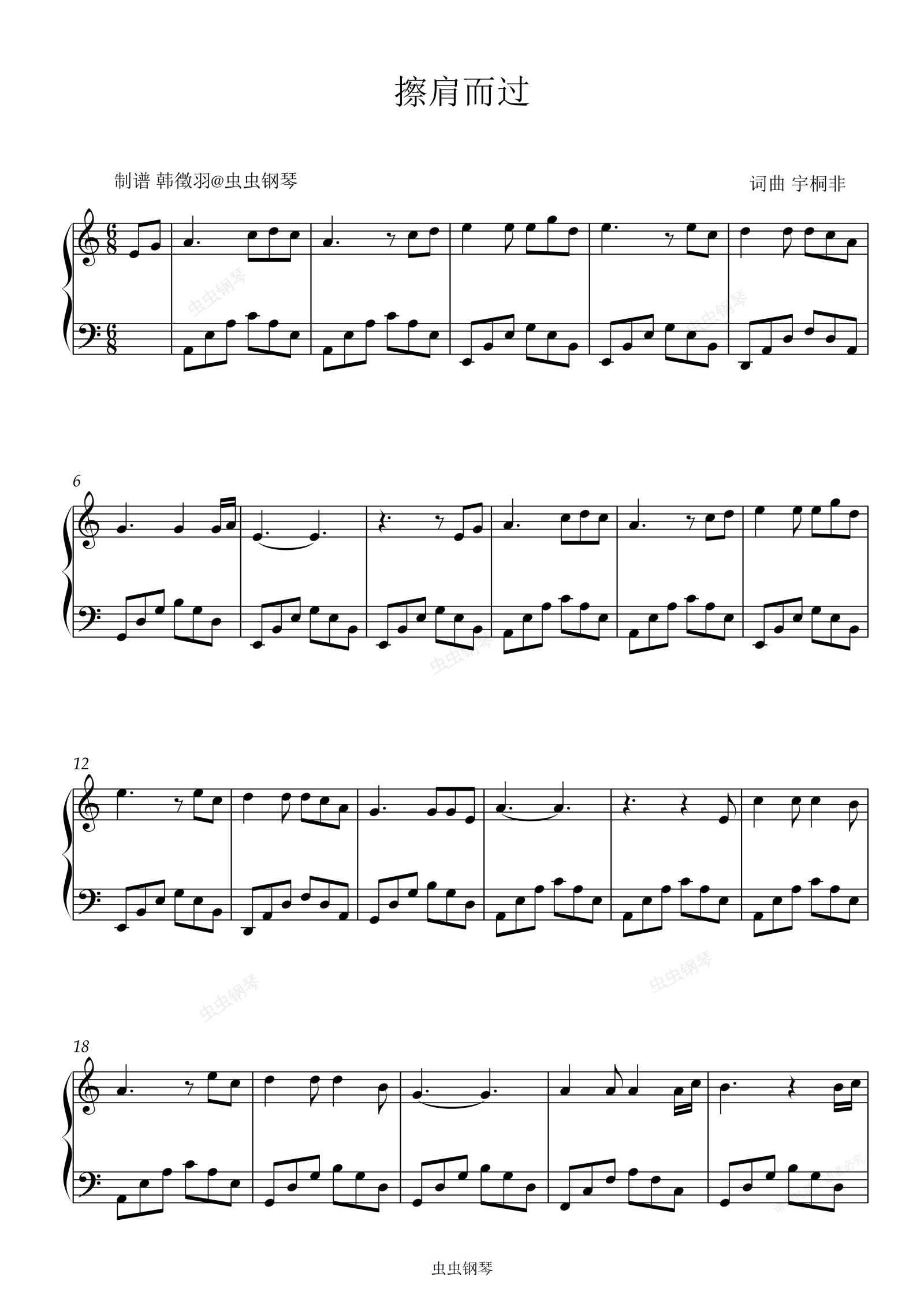 钢琴谱:宇桐非 擦肩而过 C调简易版