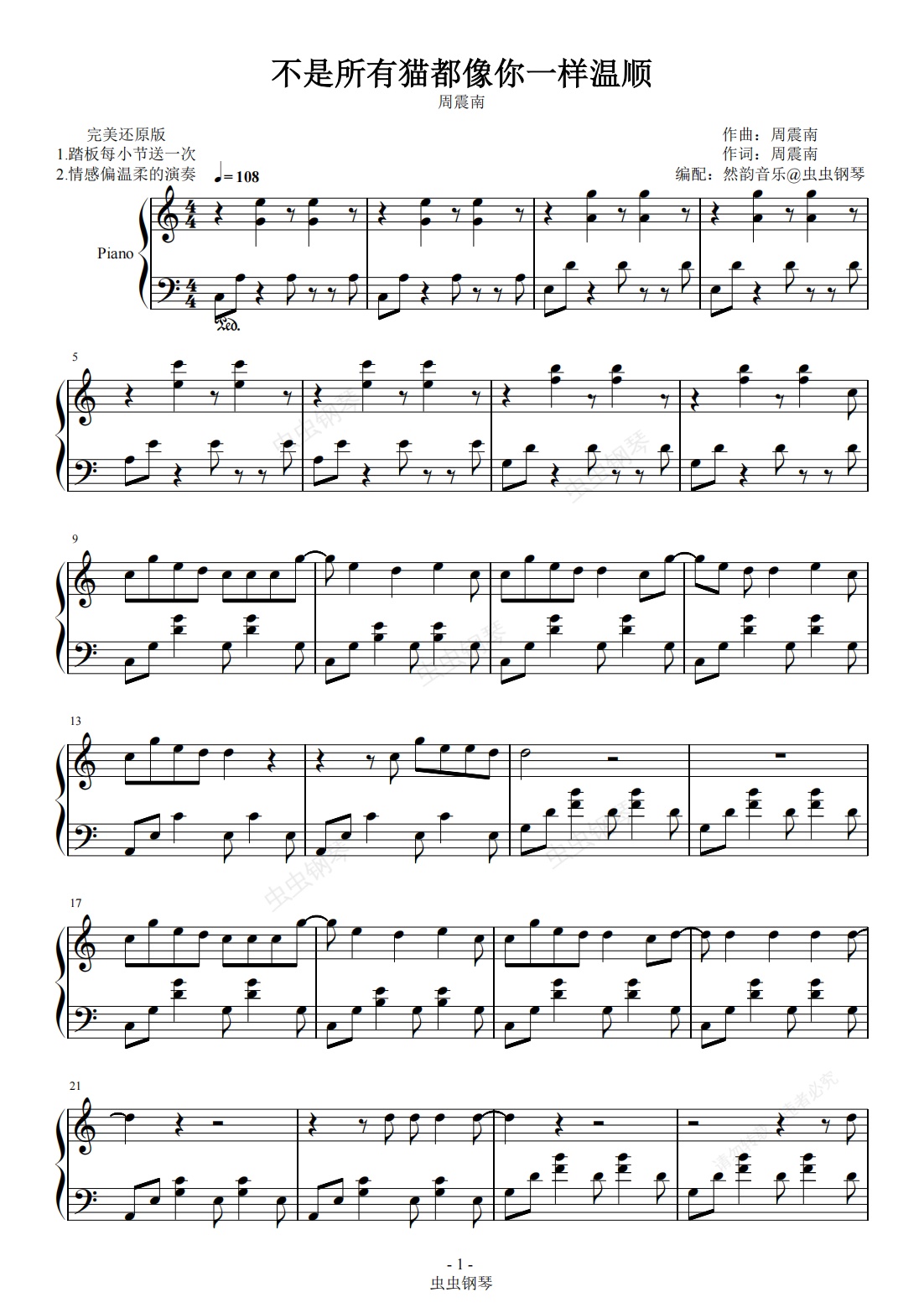 钢琴谱:【C调】不是所有猫都像你一样温顺-周震南 完美还原 然韵音乐编配