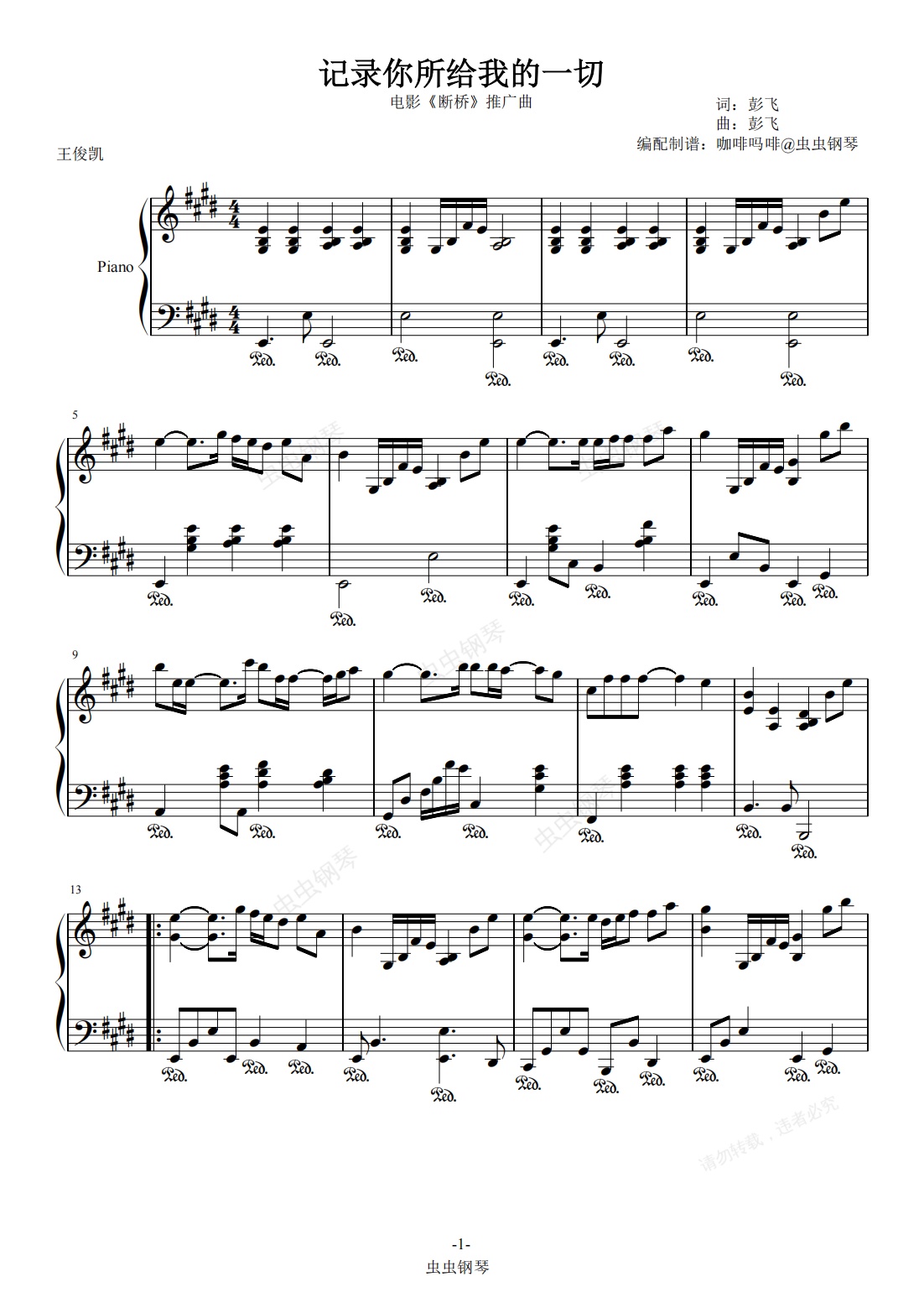 钢琴谱:记录你所给我的一切-王俊凯 钢琴独奏谱