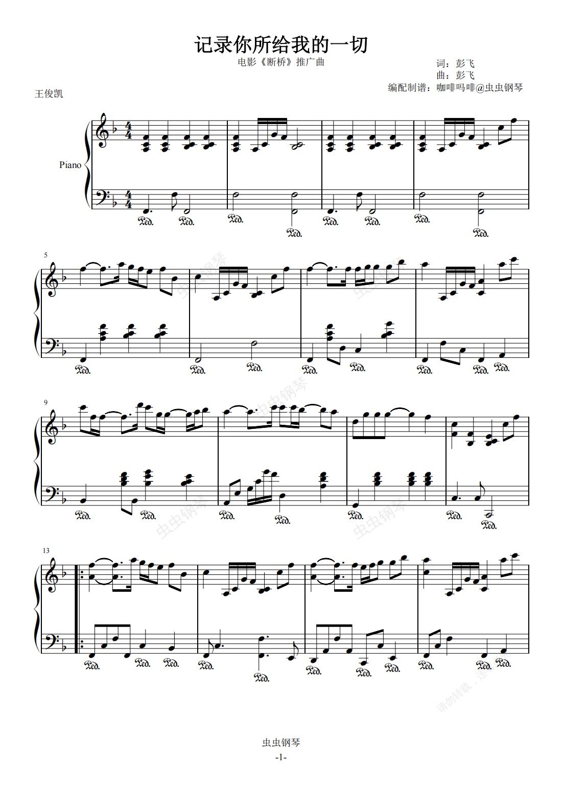 钢琴谱:记录你所给我的一切-王俊凯 F调独奏谱