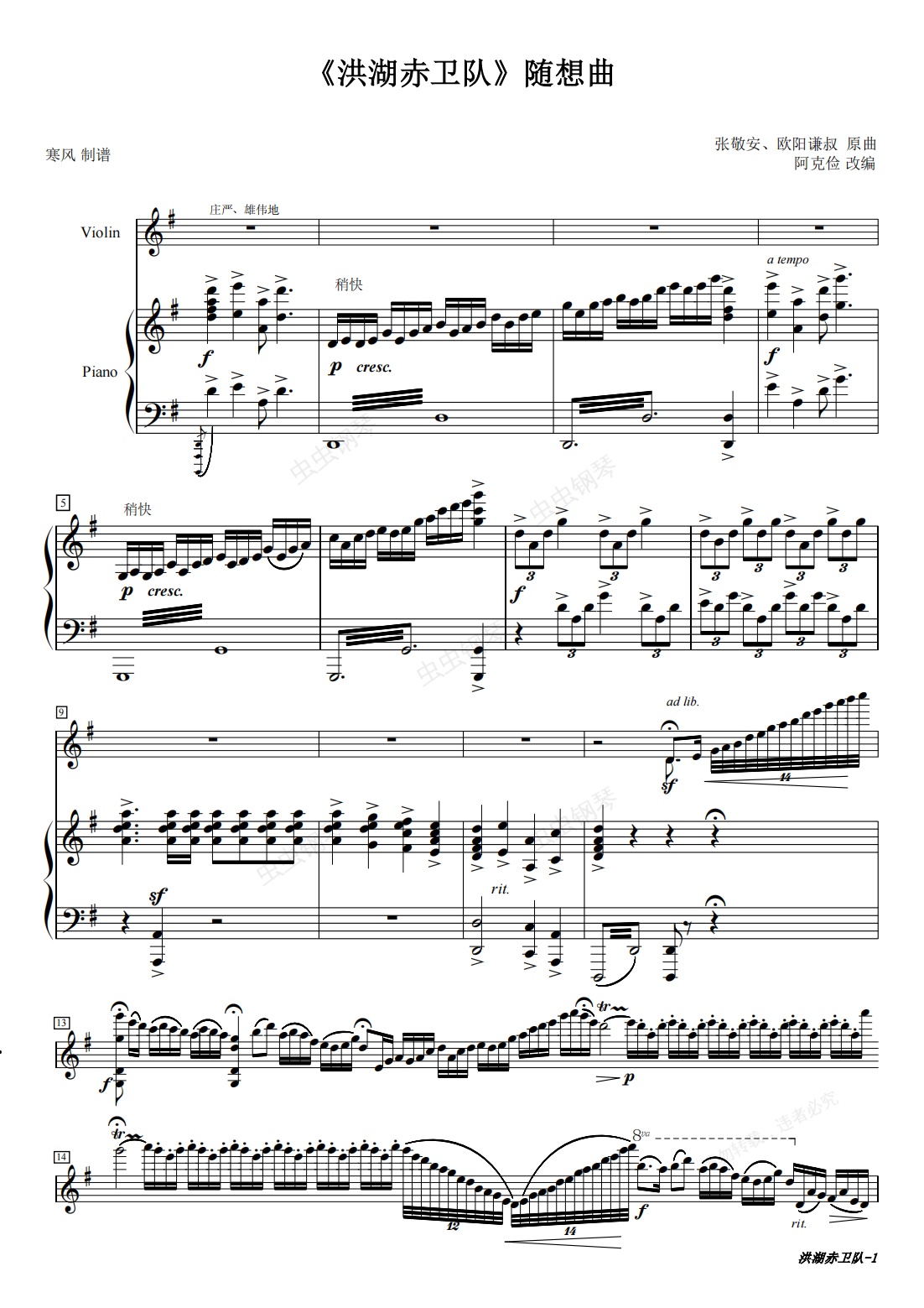 钢琴谱:洪湖水浪打浪(小提琴/钢琴)