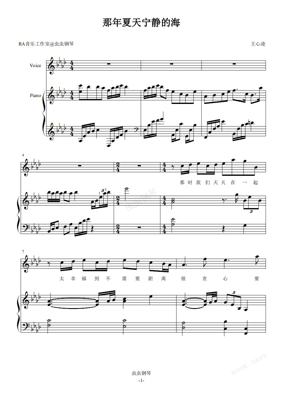 钢琴谱:大姐姐 王心凌《那年夏天宁静的海》-伴奏谱带歌词