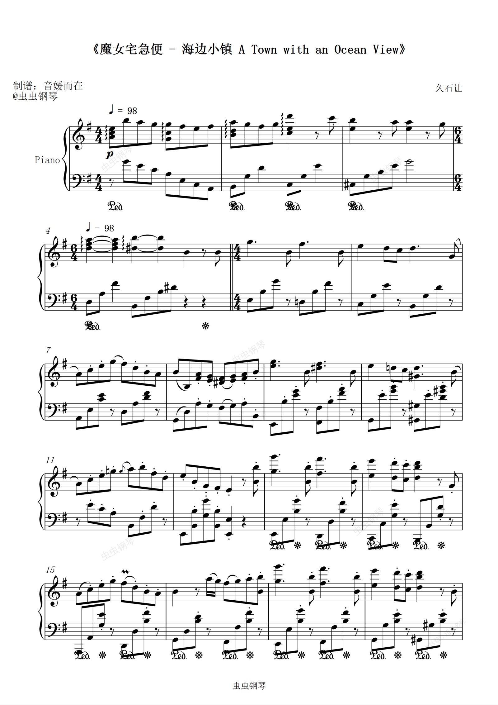 钢琴谱:久石让-《魔女宅急便 - 海边小镇 A Town with an Ocean View》
