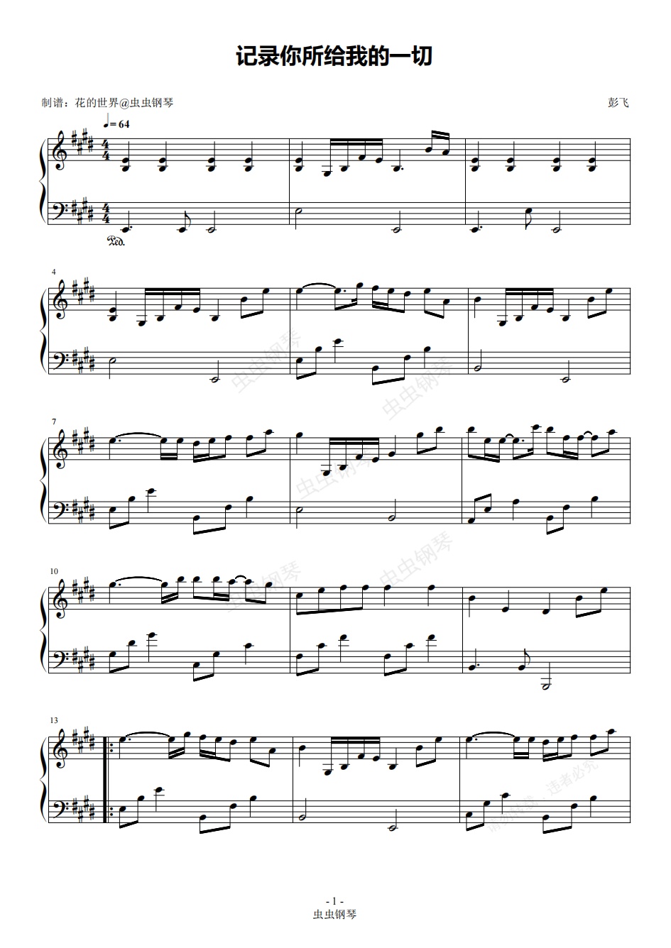 钢琴谱:记录你所给我的一切  原调简易版 王俊凯  断桥