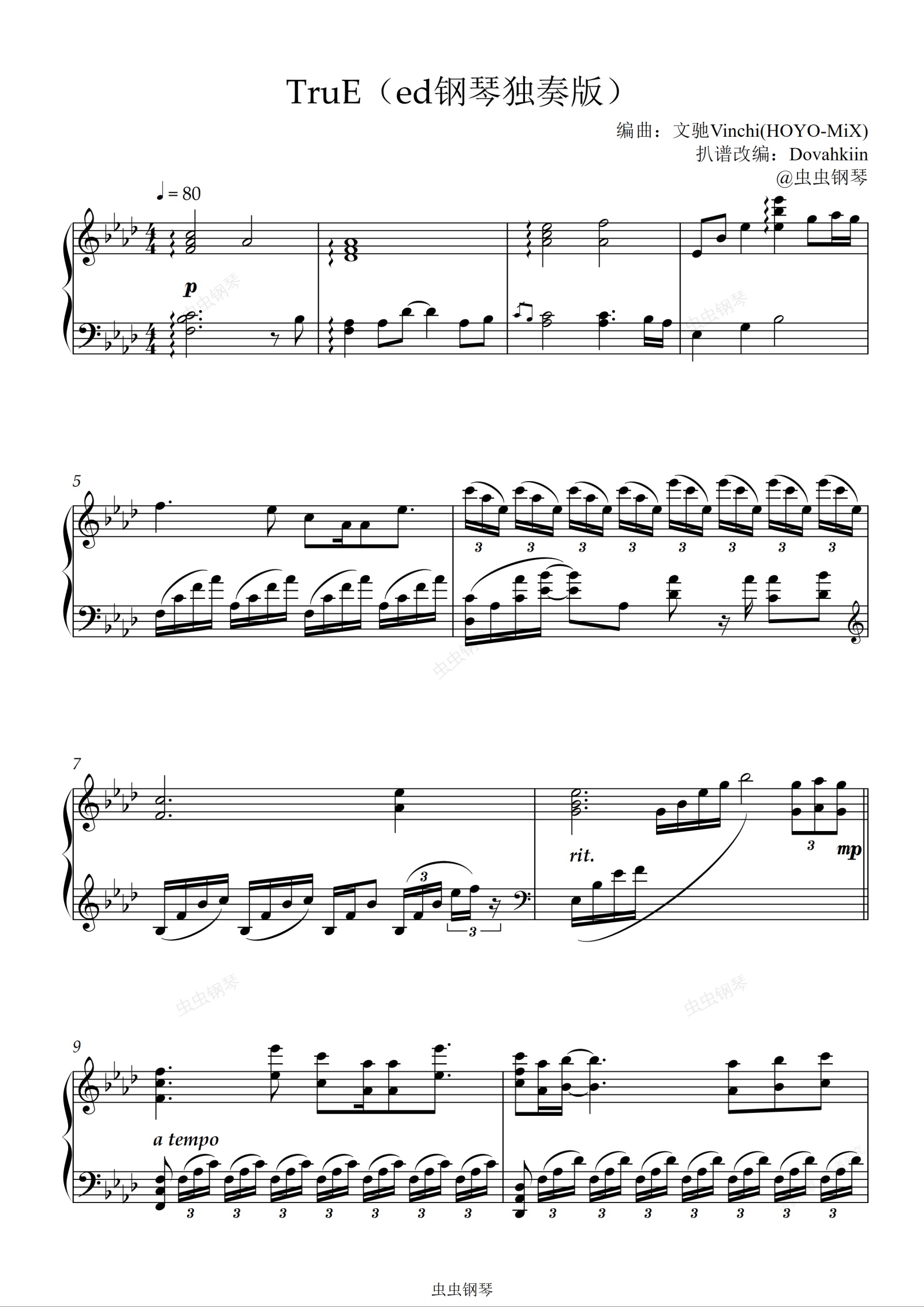 钢琴谱:【崩坏三】TruE(ed钢琴独奏版)-「因你而在的故事」ED