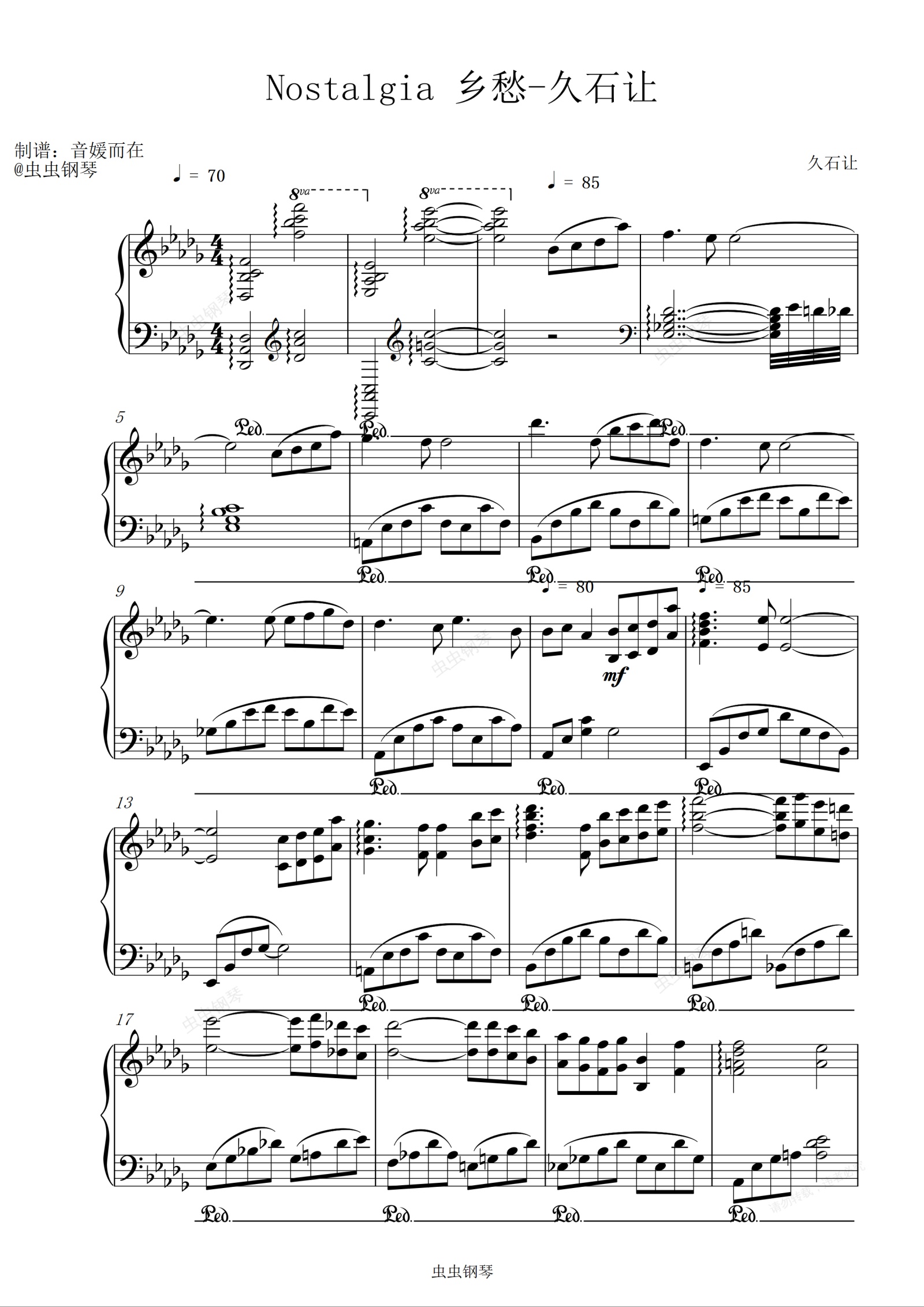 钢琴谱:Nostalgia 乡愁-久石让 【Joe Hisaishi 优美钢琴曲】