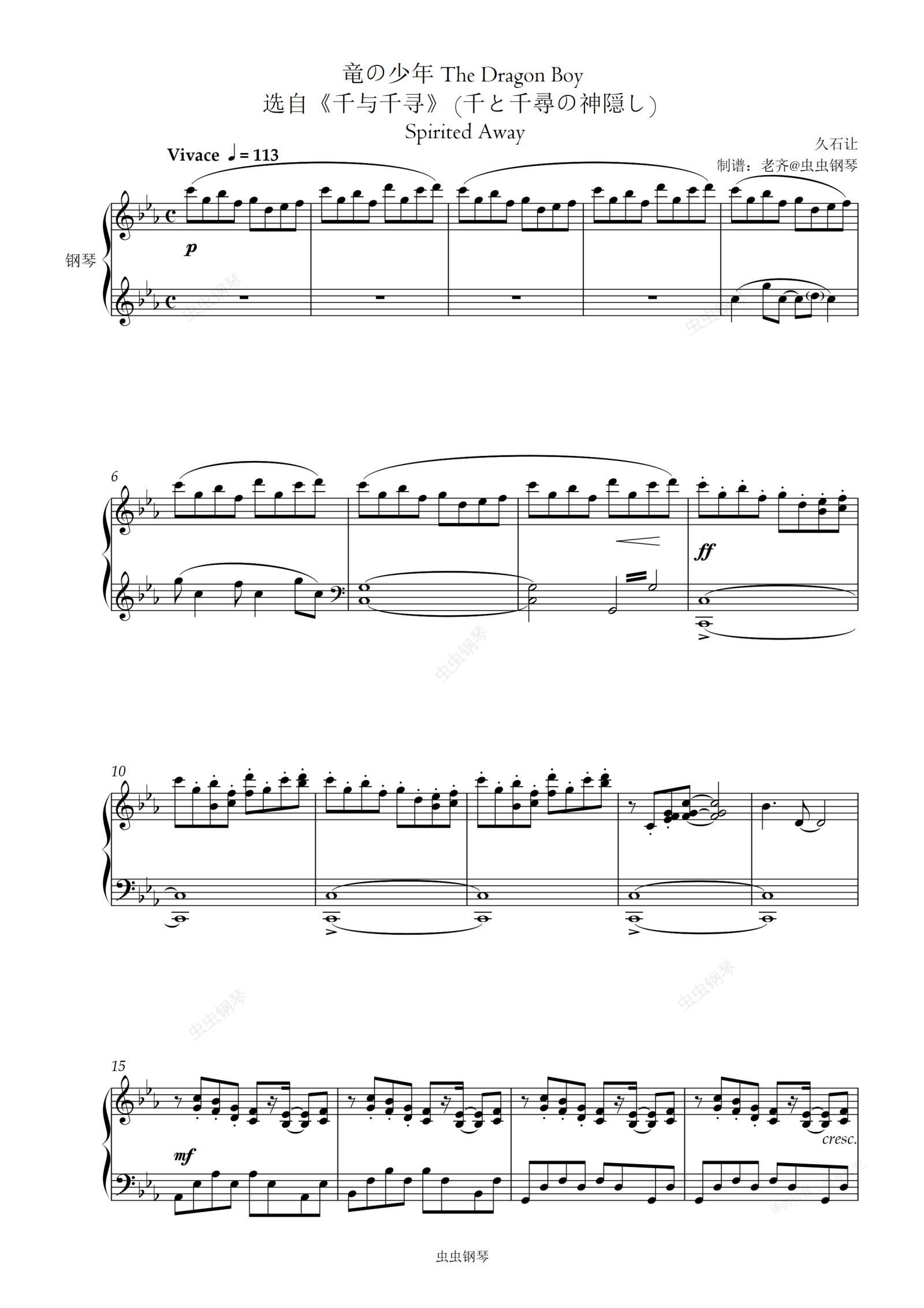 钢琴谱:【千与千寻】竜の少年 The Dragon Boy
